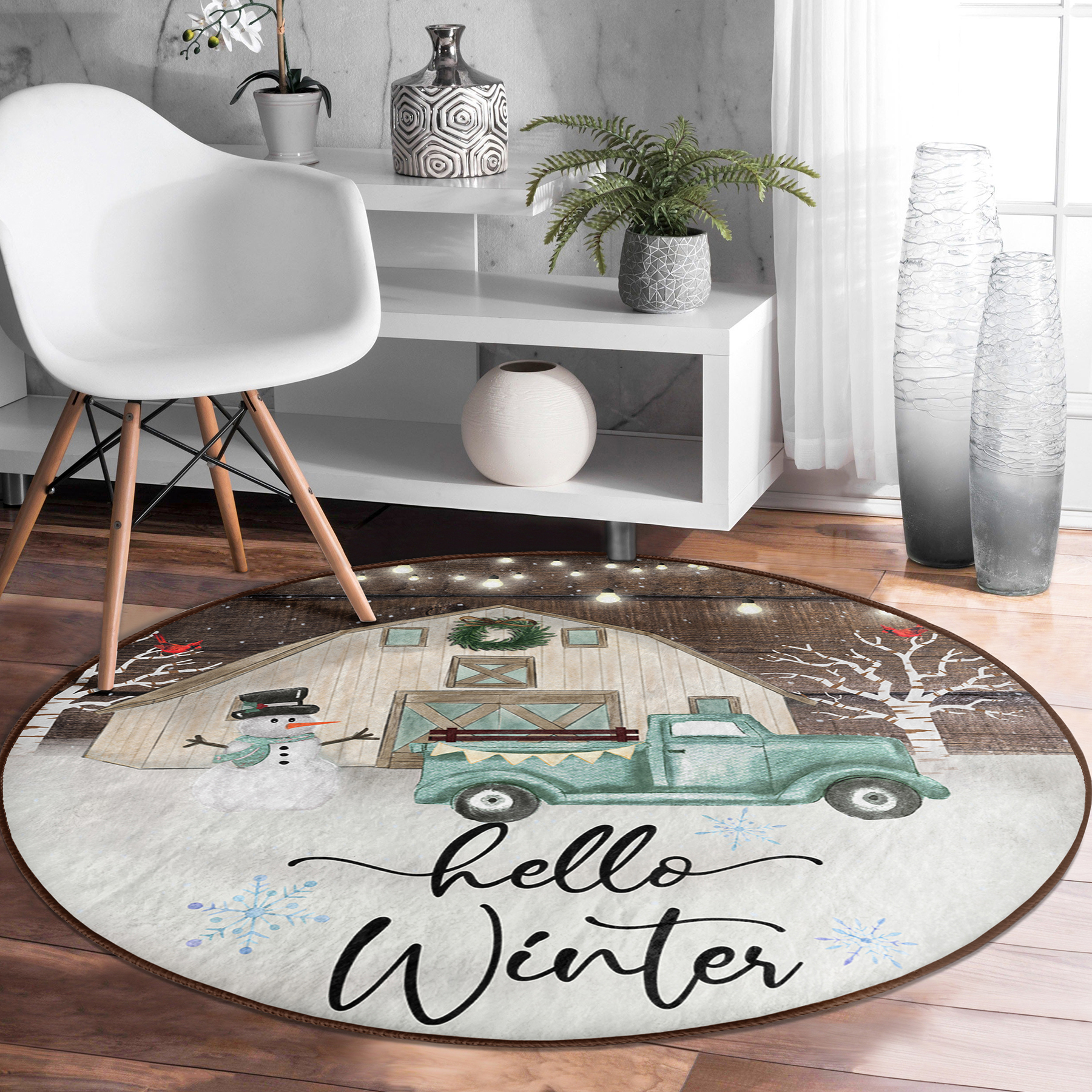 Realhomes Kar Temalı Hello Winter Tasarımlı Kahverengi Outdoor Yıkanabilir Kaymaz Tabanlı Yuvarlak Halı