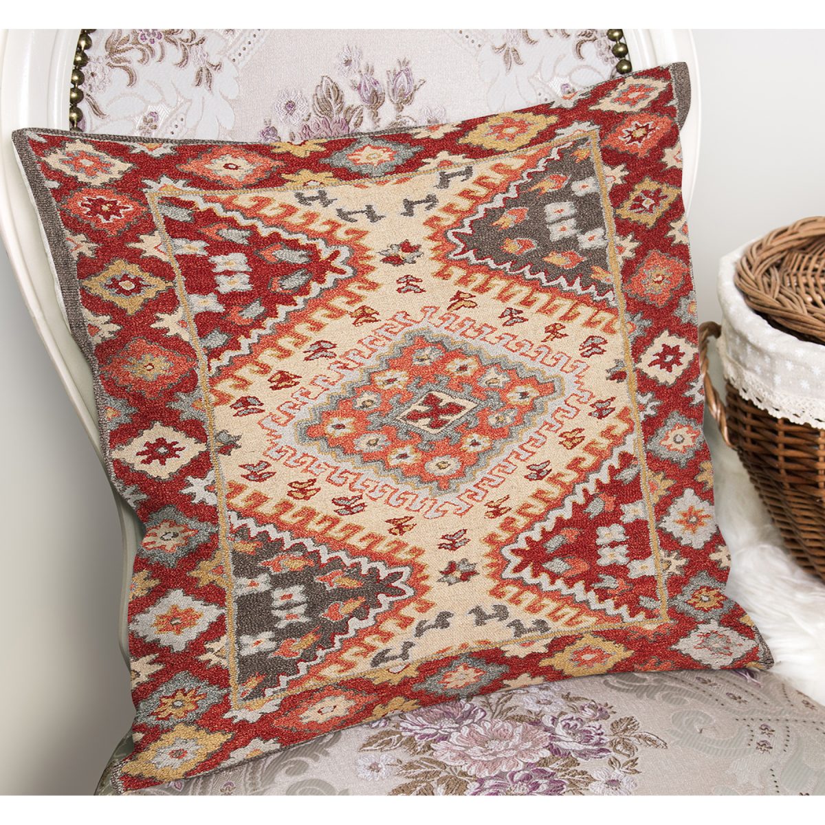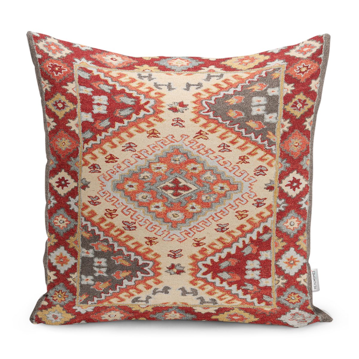 RealHomes Kırmızı Zeminde Etnik Motifli Kilim Desenli Dijital Baskılı Yastık Kırlent Kılıfı