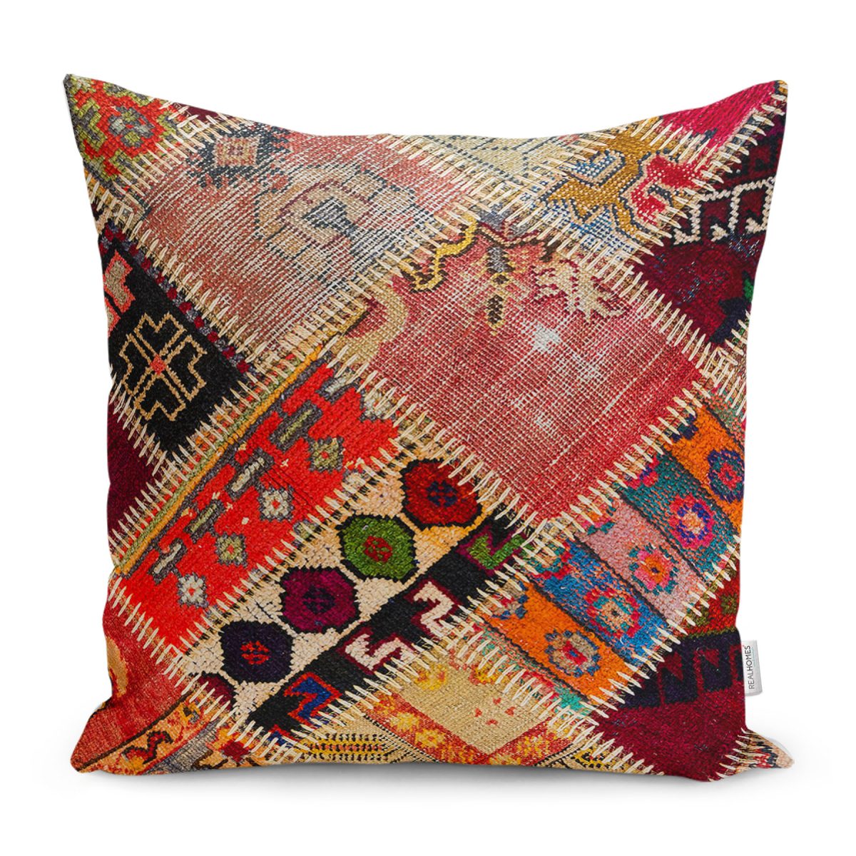 RealHomes Kırmızı Zeminde Patchwork Motifli Geleneksel Desenli Dijital Baskılı Yastık Kırlent Kılıfı Realhomes