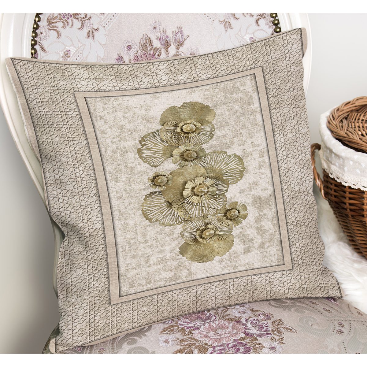 RealHomes Krem - Gold Zeminde Altık Çiçek Motifli Çerçeve Desenli Dijital Baskılı Yastık Kırlent Kılıfı