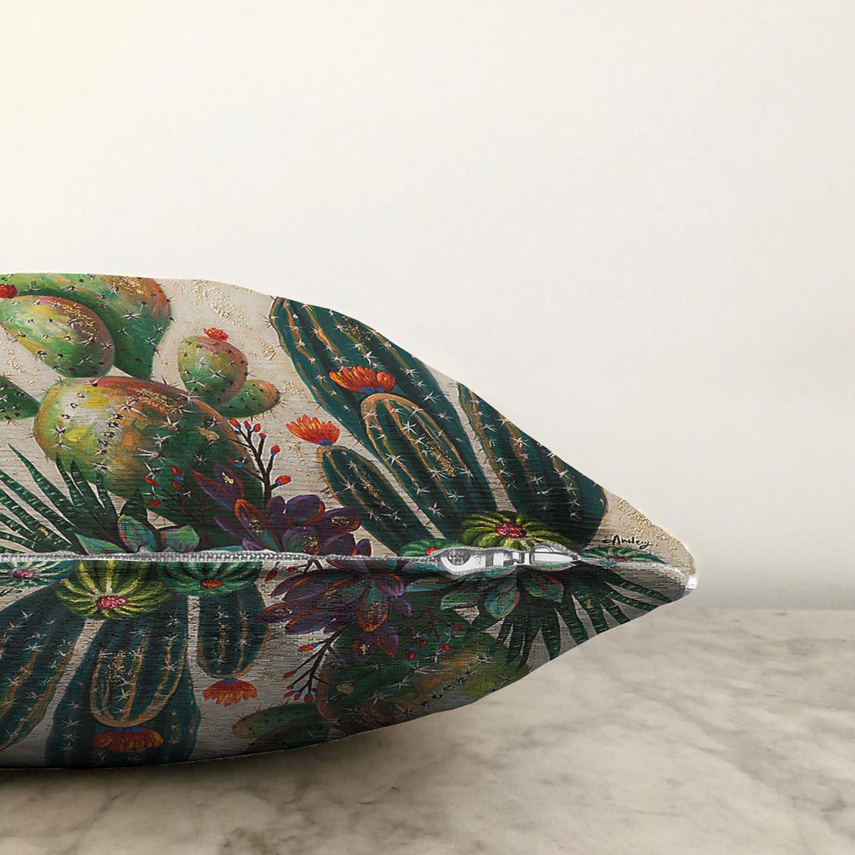 Realhomes Krem Zemin Yeşil Kaktüsler Dijital Baskılı Özel Tasarım Dekoratif Yastık Kırlent Kılıfı