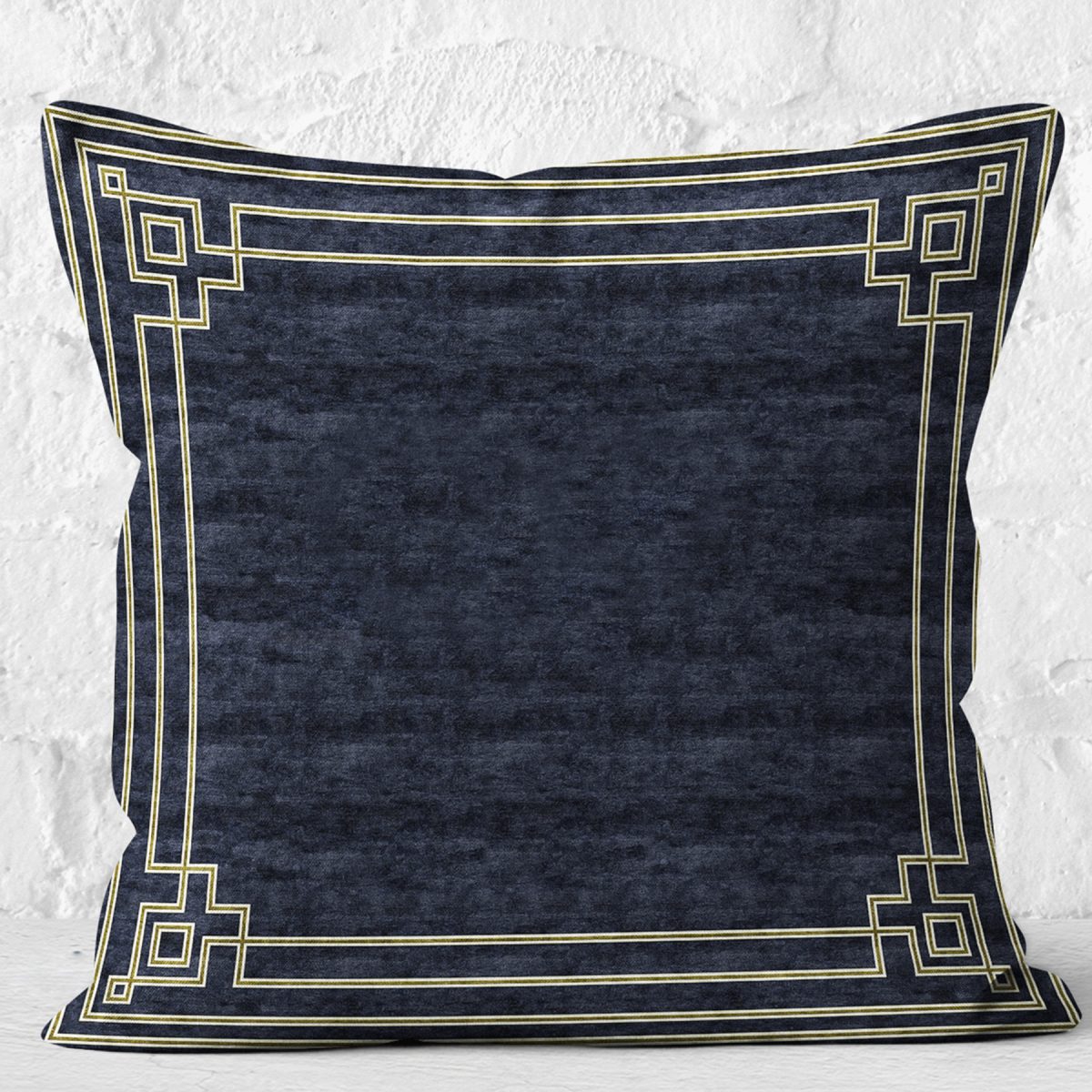 RealHomes Lacivert Zeminde Çerçeveli Motifli Rustik Desenli Dijital Baskılı Yastık Kırlent Kılıfı