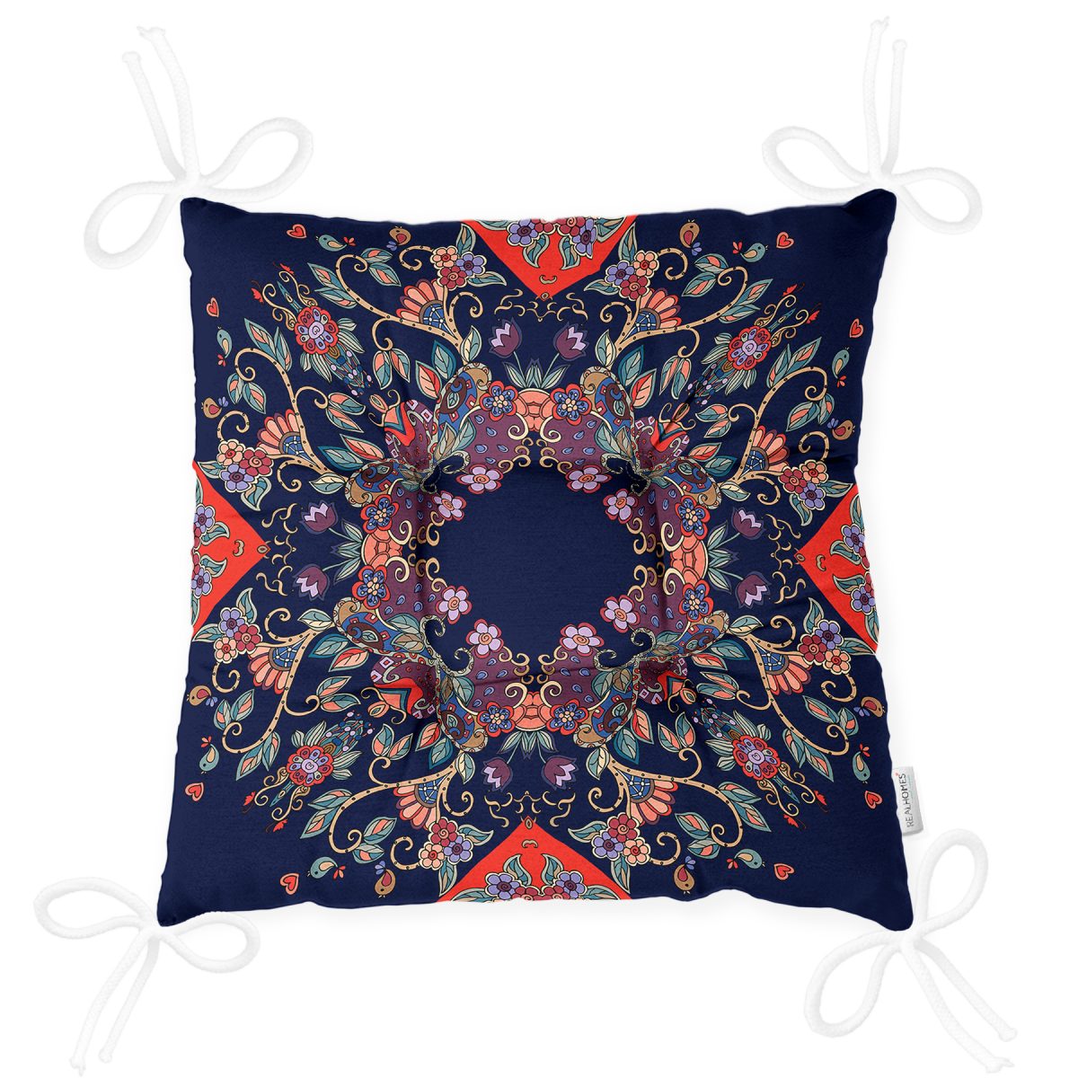 Realhomes Lacivert Zeminli Etnik Motifler Dijital Baskılı Modern Pofuduk Sandalye Minderi Realhomes