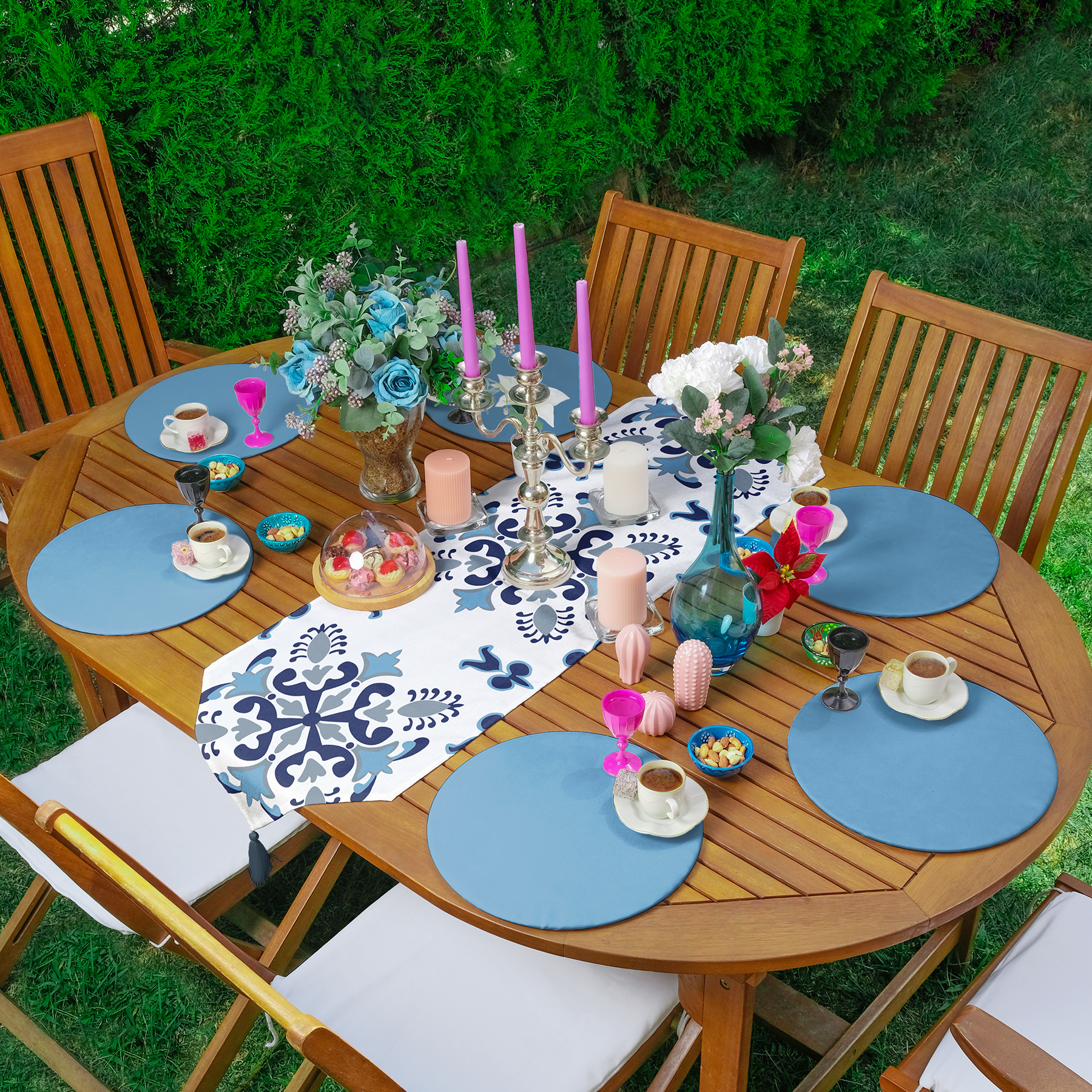 Realhomes Mavi Çini Motifli Püsküllü Runner & 6’lı Mavi Düz Renk Supla – Servis Altlığı