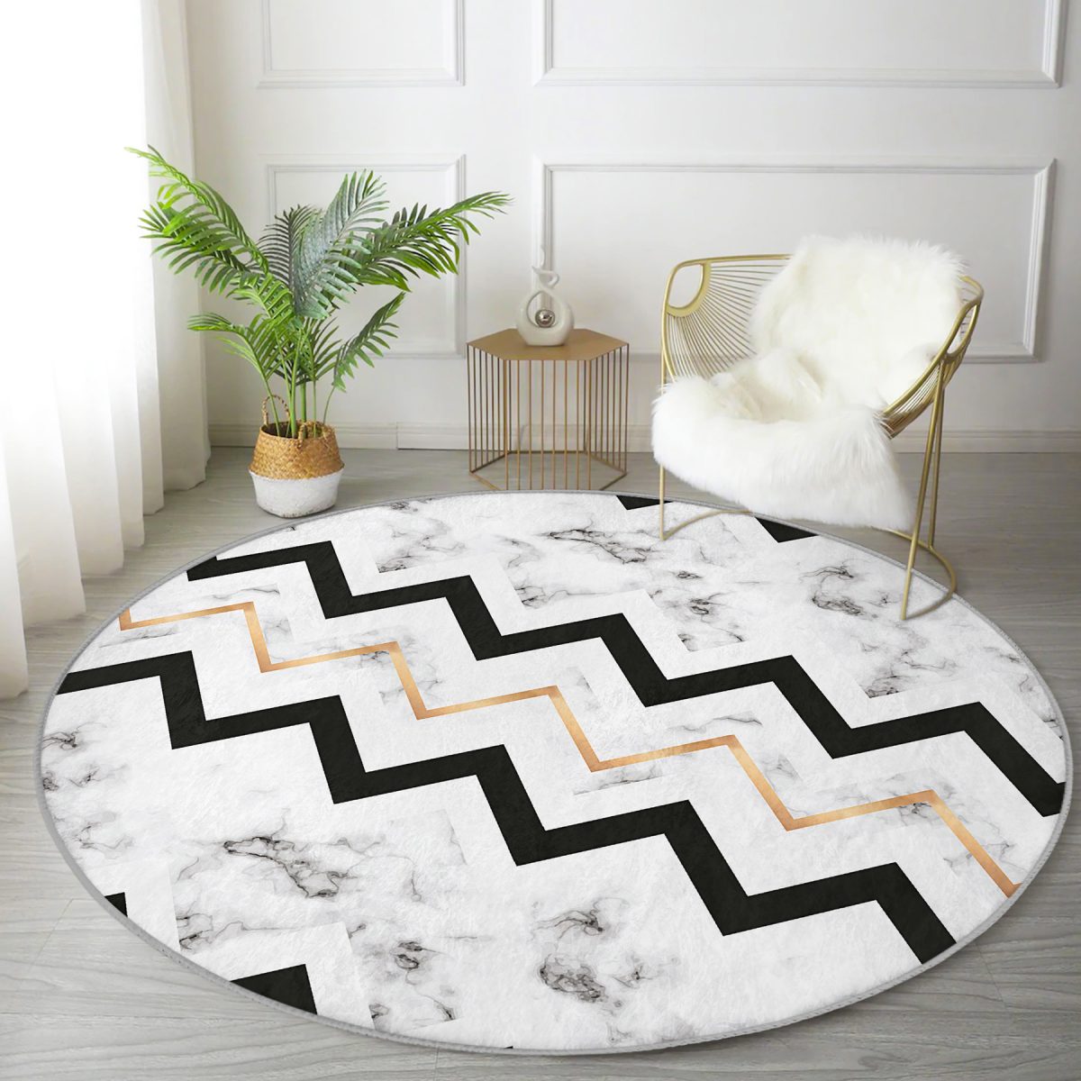 Realhomes Mermer Zemin Geometrik Zigzag Tasarımlı Siyah Ofis Yıkanabilir Kaymaz Tabanlı Yuvarlak Halı