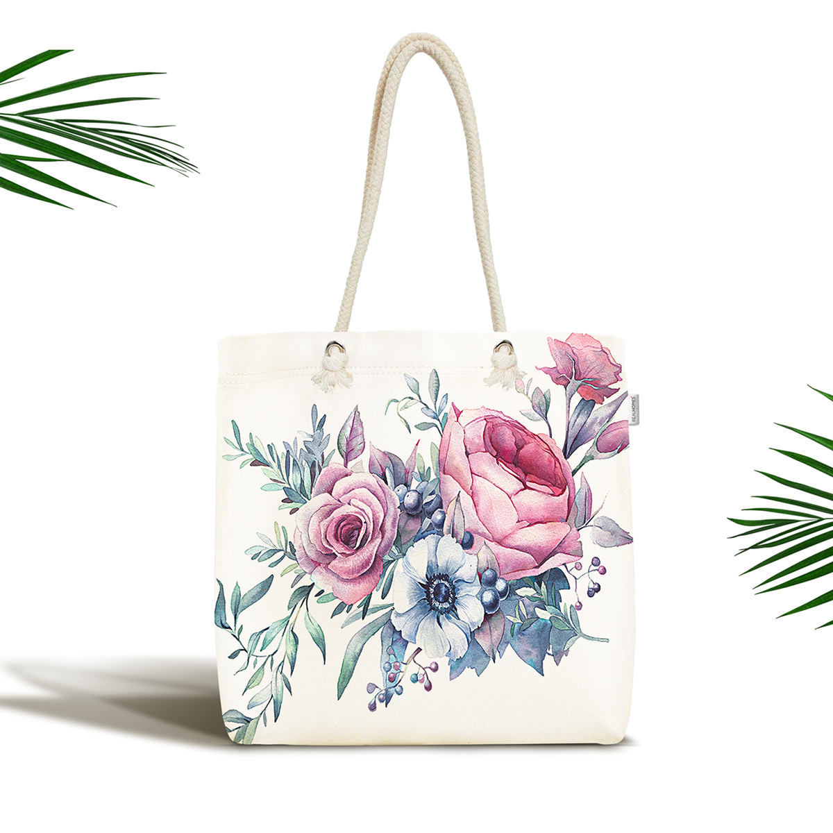 Realhomes Özel Tasarım Çiçek Desenli Dijital Baskılı Kumaş Plaj Çantası Realhomes