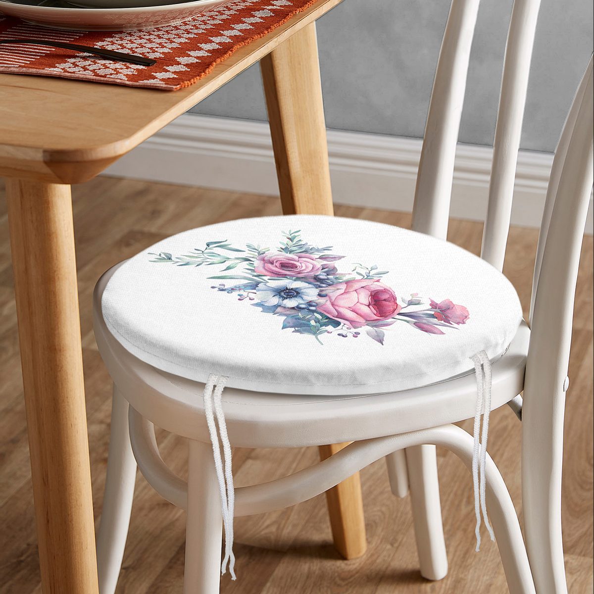 Realhomes Özel Tasarım Çiçek Desenli Dijital Baskılı Yuvarlak Fermuarlı Sandalye Minderi