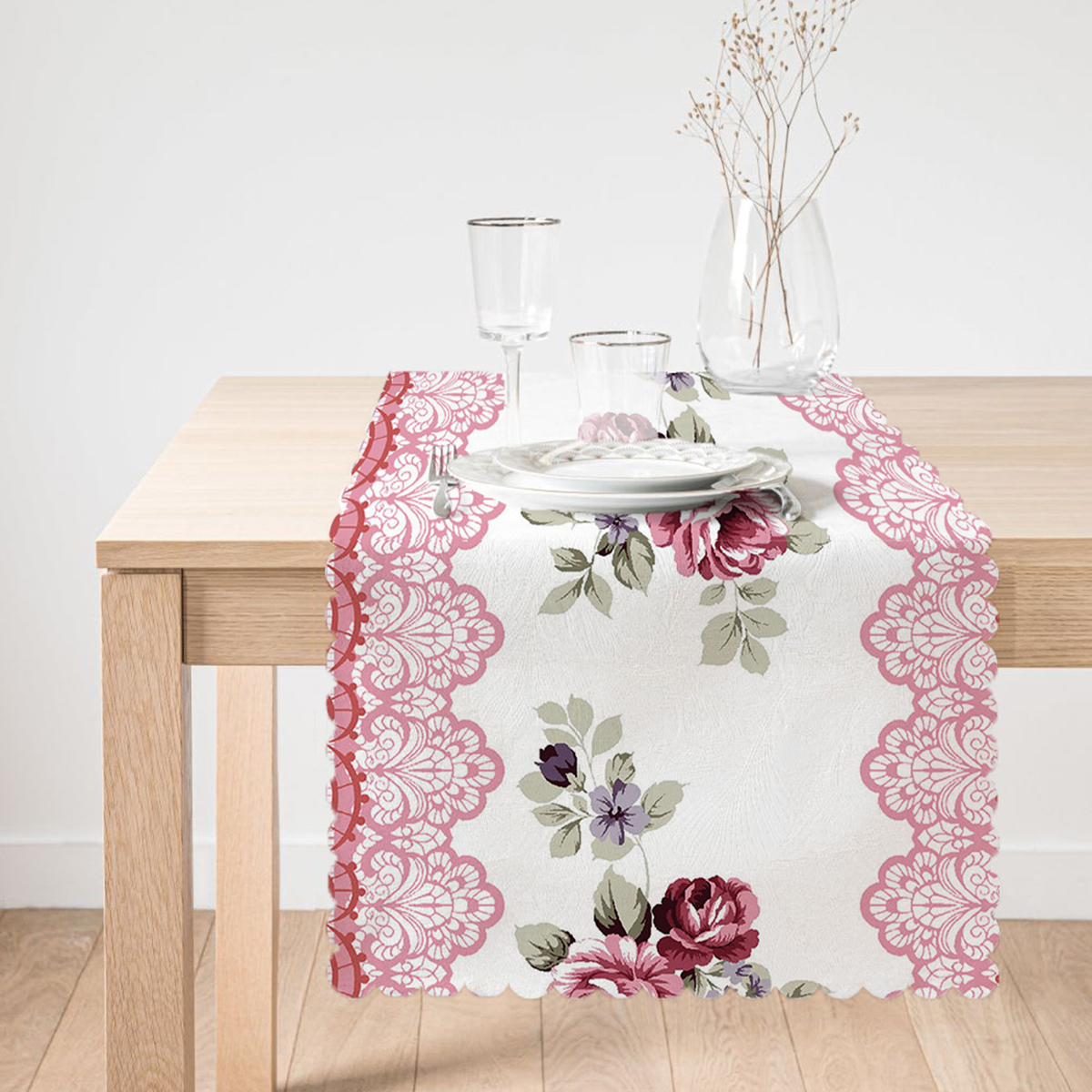 Runnerlarımızın kenar detayında oryantal işleme bulunmaktadır. İsteğe bağlı olarak kenar detayı düz kesim olarak değiştirilebilir.