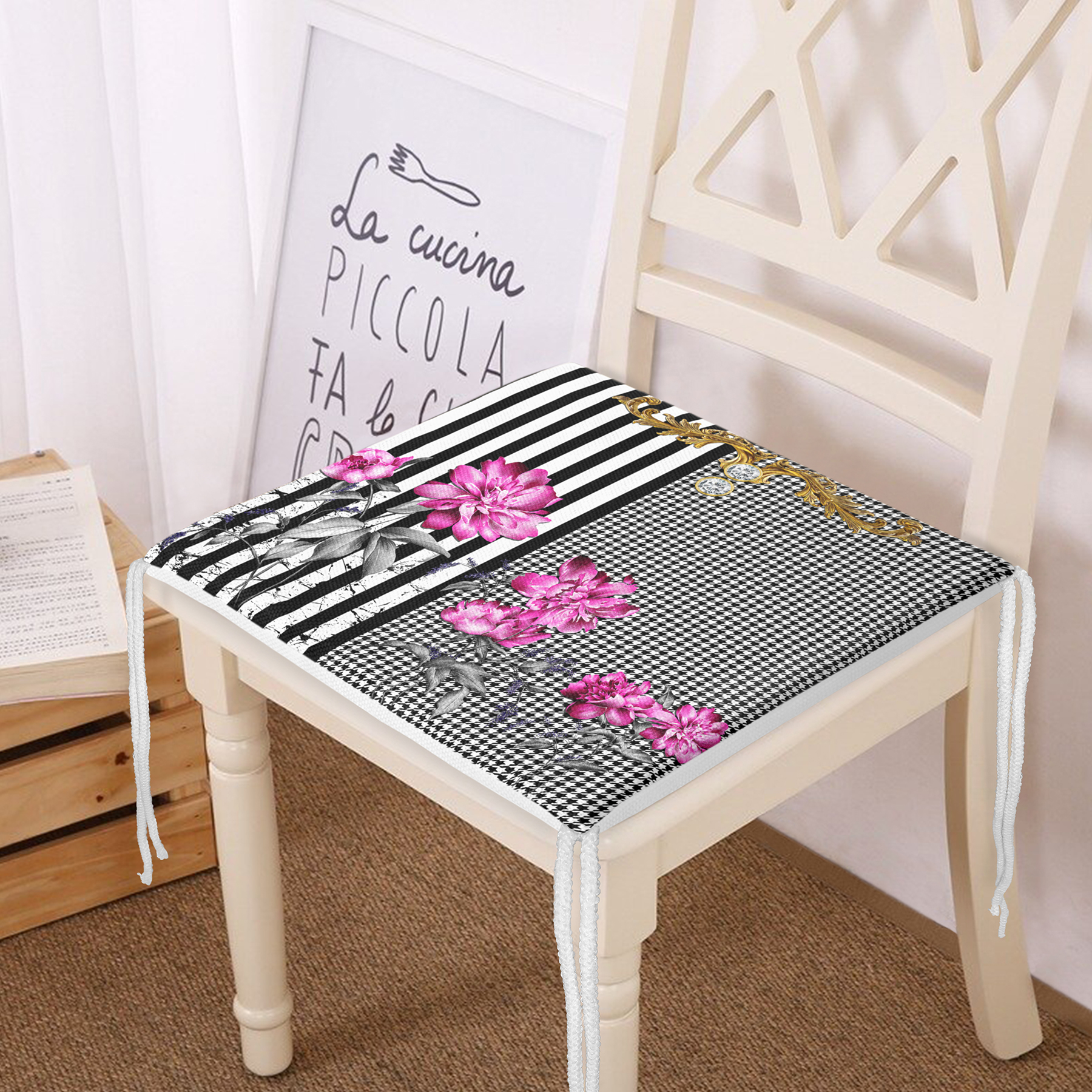 RealHomes Dijital Baskılı Fermuarlı Sandalye Minderi, kumaş seçimi ve desen detaylarıyla şık bir dekorasyon ögesi olarak kullanımınıza sunulmaktadır. Her bir desen RealHomes tasarımcıları tarafından özenle tasarlanmış ve satışa sunulmuştur. Fotoğraf kalitesinde canlı ve gerçekçi baskılarımız yıkamaya ve kullanıma bağlı olarak solma yapmaz, yıllar boyu ilk günkü özelliğini korur.