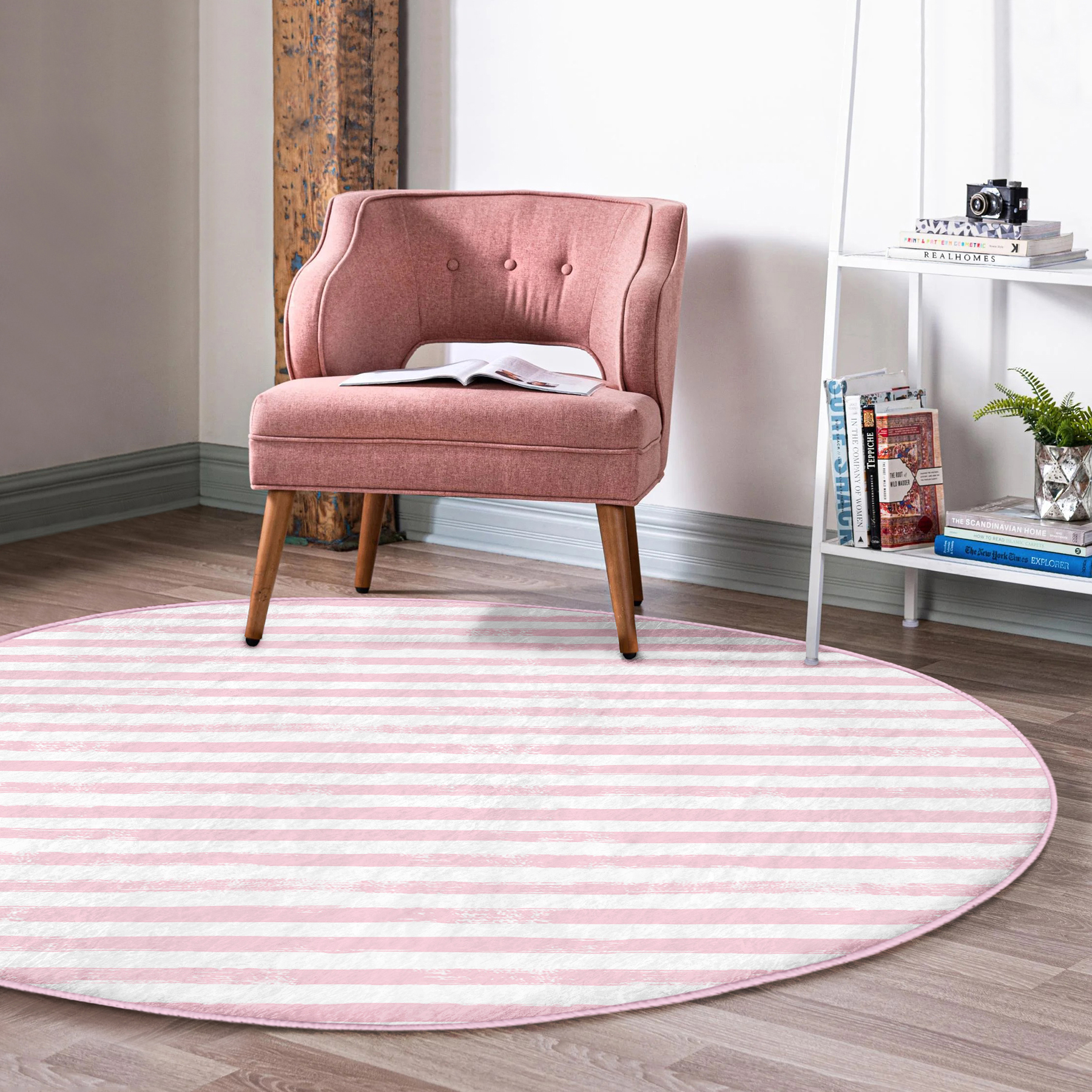Realhomes Pembe Çizgili Motifli Modern Salon ve Oturma Odası Yıkanabilir Kaymaz Tabanlı Yuvarlak Halı