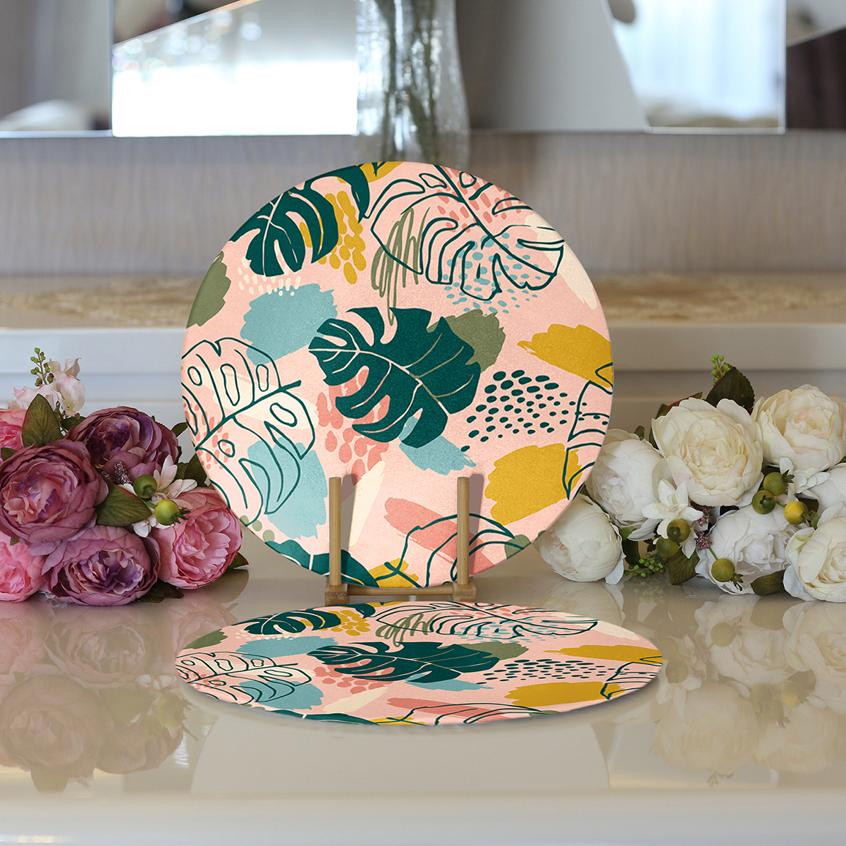 Realhomes Pudra Zemin Üzerinde Onedraw Çizimli Yaprak Desenli 2’li Yuvarlak Servis Altlığı – Supla