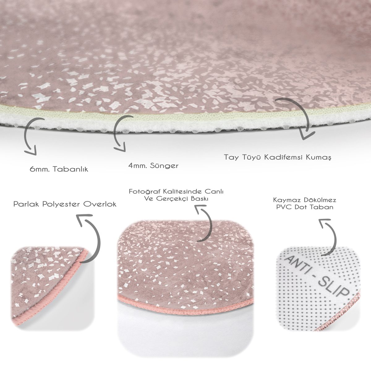 Tabanlık ve Dolgu: 10 mm Kaymaz dokuma tabanlıdır.