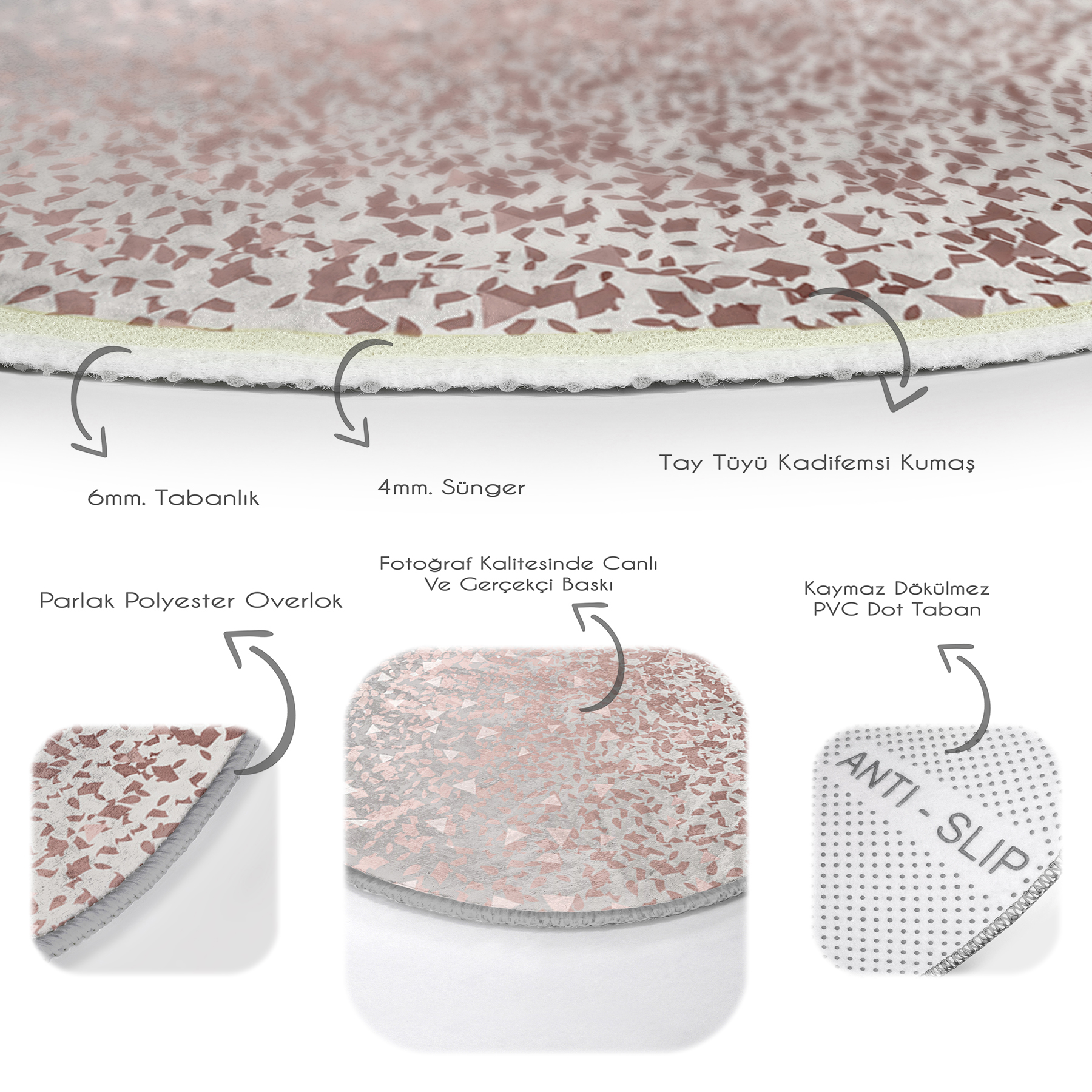 Tabanlık ve Dolgu: 10 mm Kaymaz dokuma tabanlıdır.
