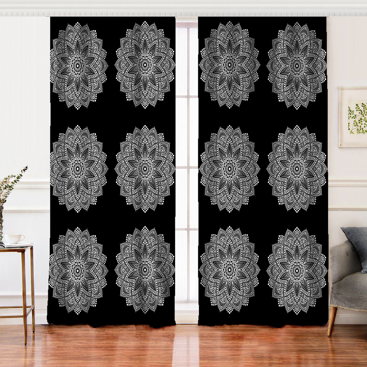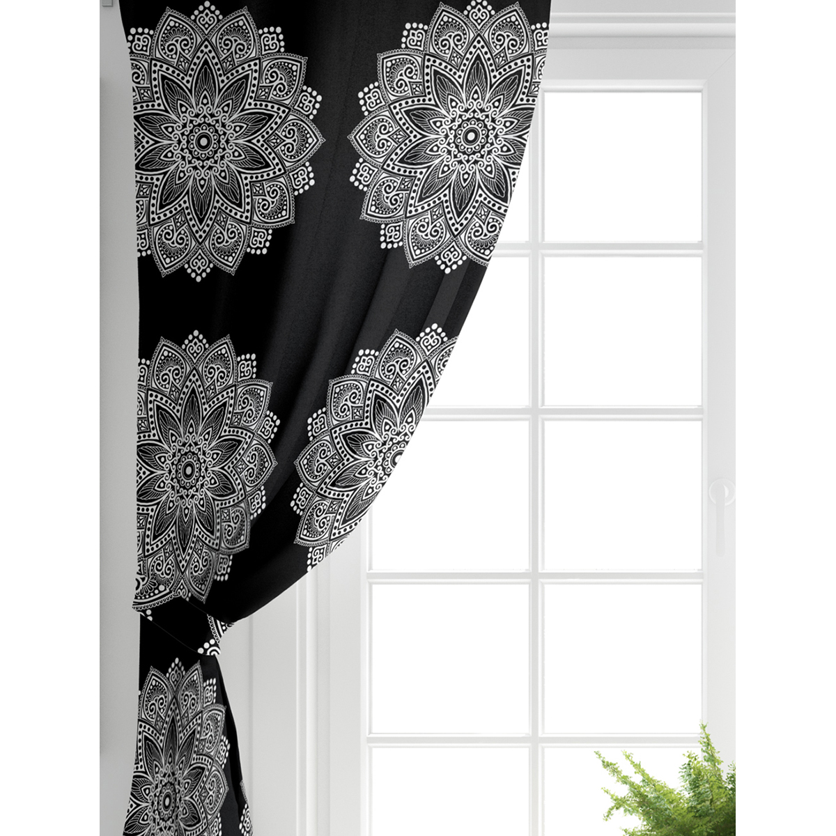 Realhomes Siyah Beyaz Mandala Tasarımlı Modern Salon Fon Perde