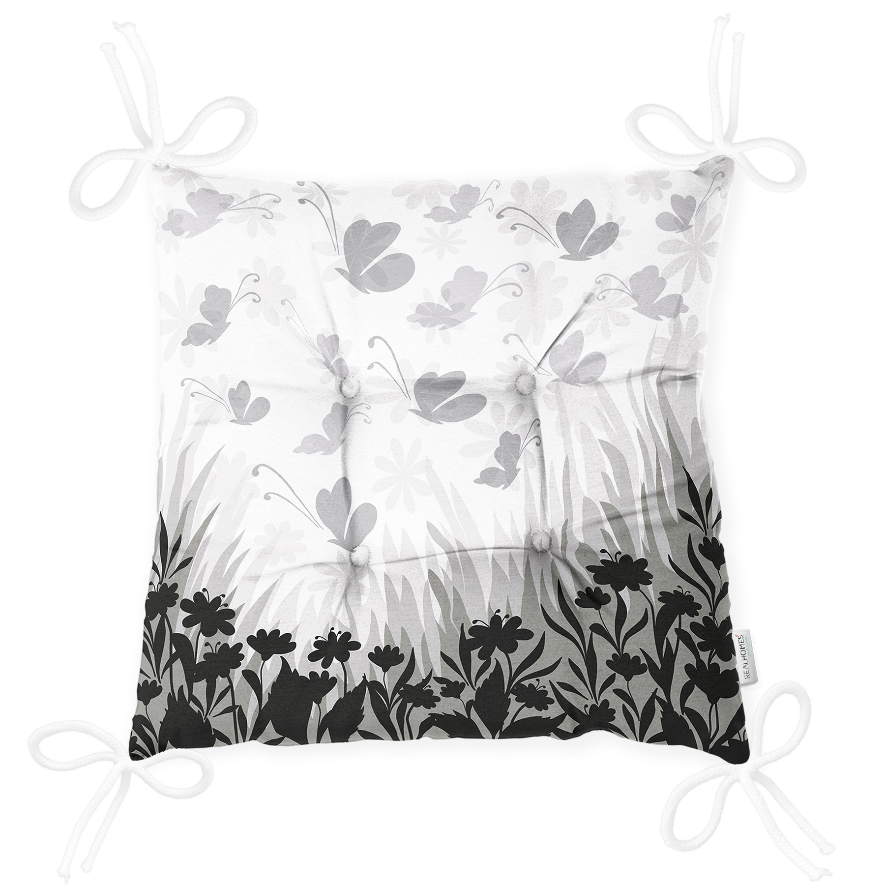 RealHomes Siyah Çiçekler Üzerinde Kelebek Motifli Özel Tasarım Pofuduk Sandalye Minderi