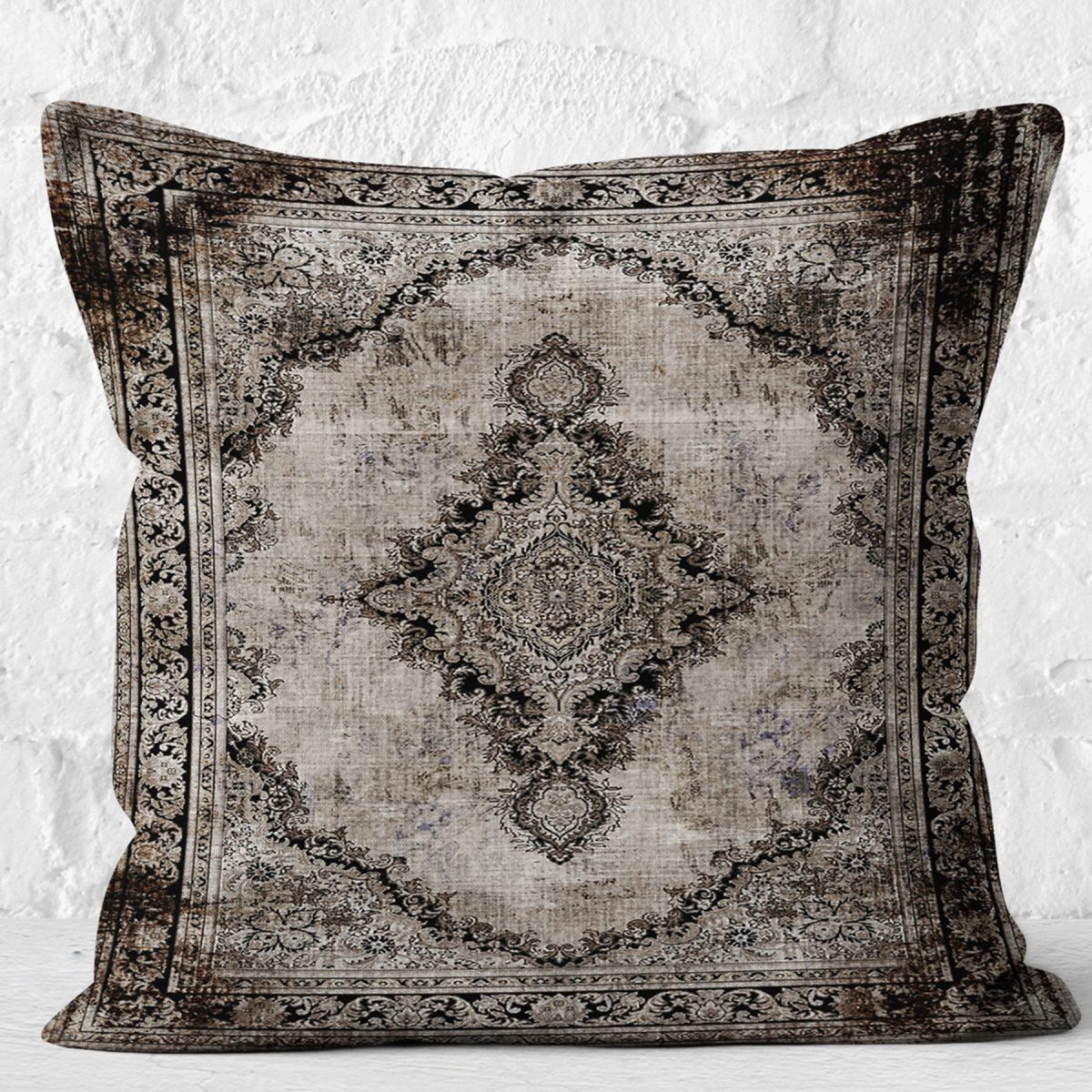 RealHomes Siyah – Kahve Zeminde Kilim Motifli Uşak Desenli Dijital Baskılı Yastık Kırlent Kılıfı