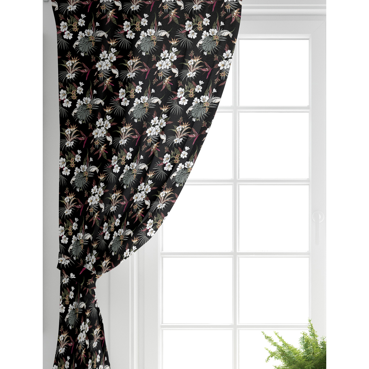 Realhomes Siyah Zemin Üzerinde Beyaz Çiçek Desenli Dijital Baskılı Modern Salon Fon Perde