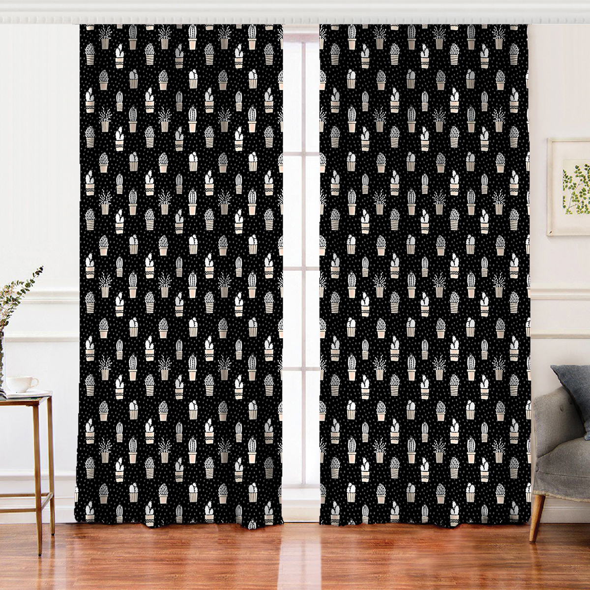 Realhomes Siyah Zemin Üzerinde Kaktüs Desenli Dijital Baskılı Modern Salon Fon Perde