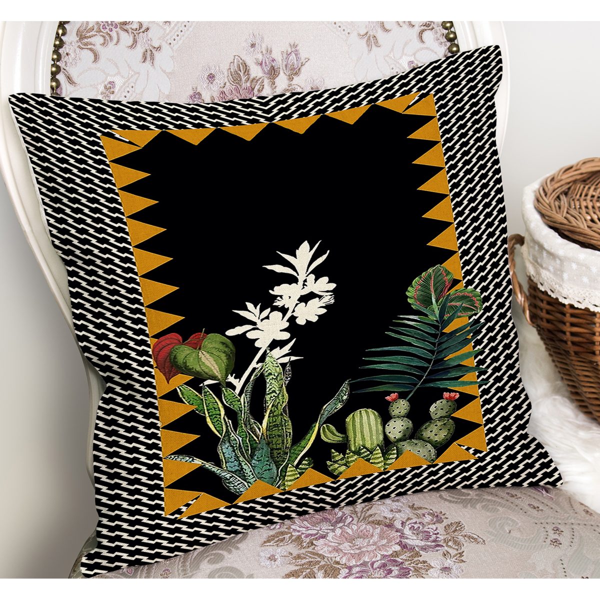 RealHomes Siyah Zeminde Çerçeveli Motifli Çiçek Desenli Dijital Baskılı Yastık Kırlent Kılıfı Realhomes