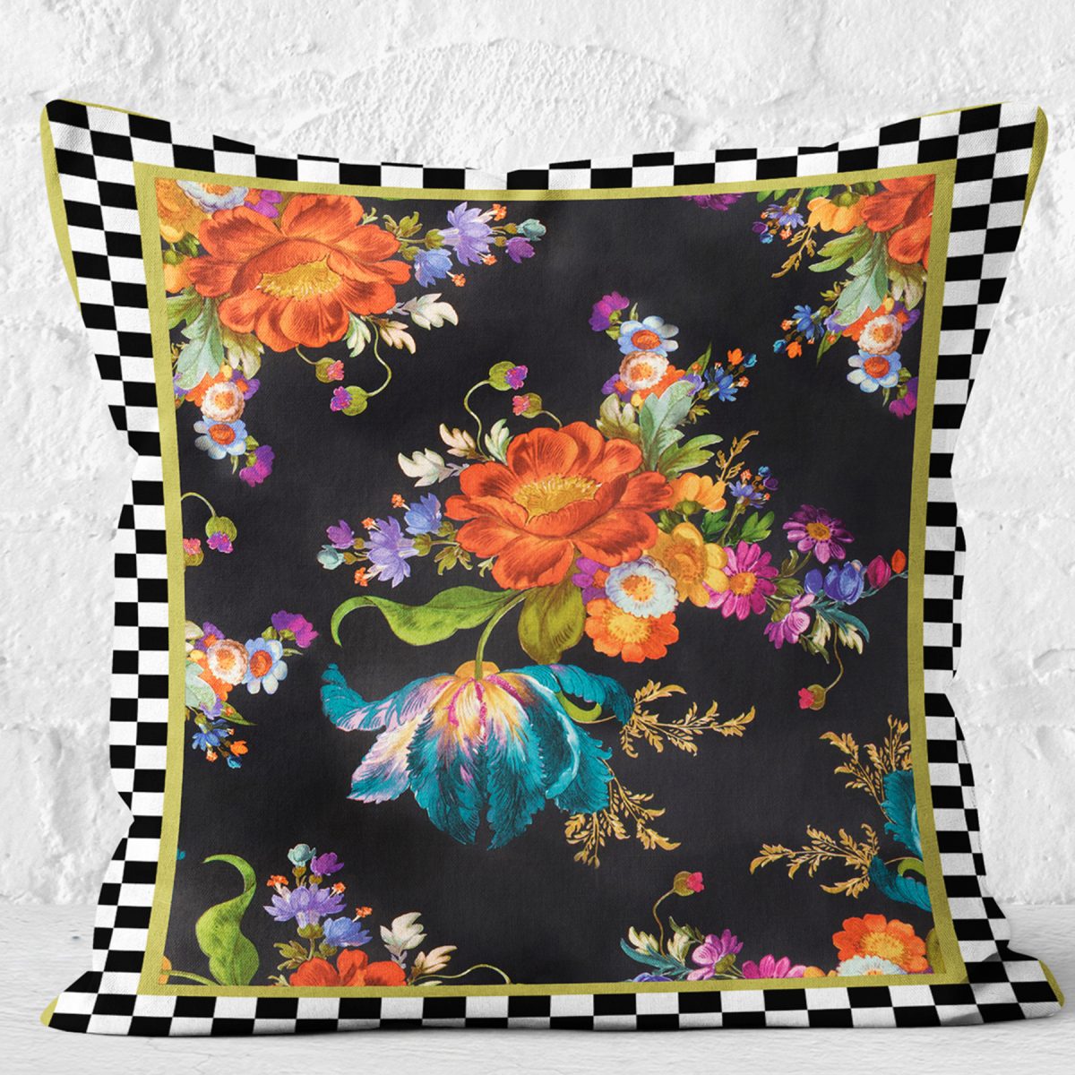 RealHomes Siyah Zeminde Dama Motifli Çiçek Desenli Dijital Baskılı Yastık Kırlent Kılıfı Realhomes
