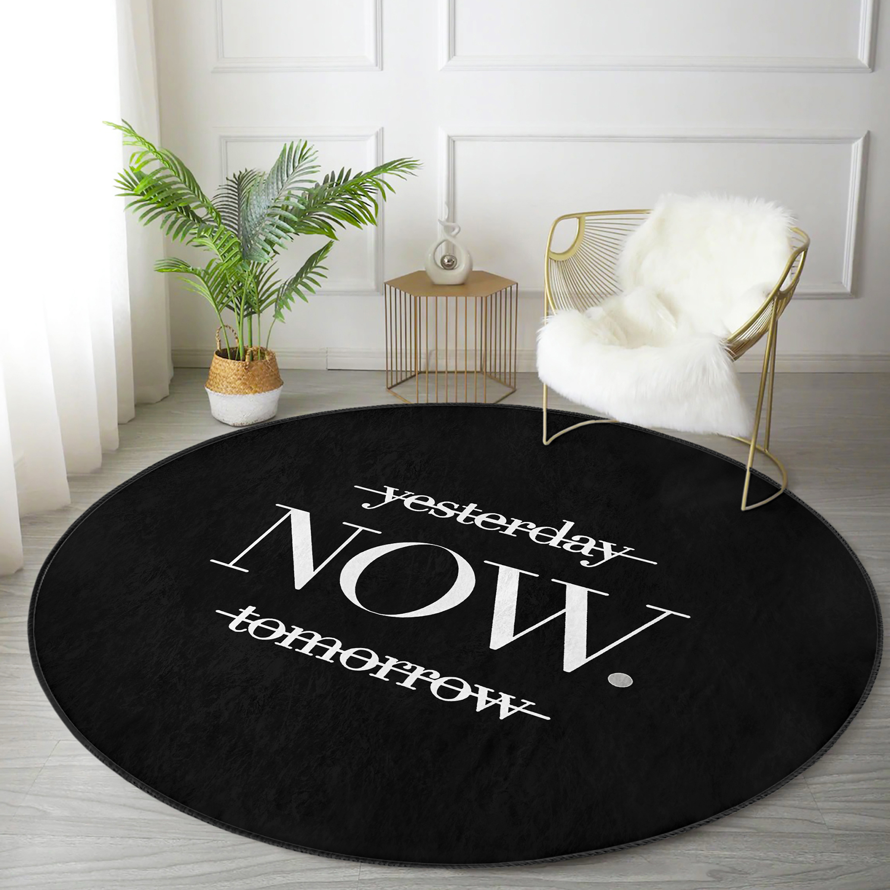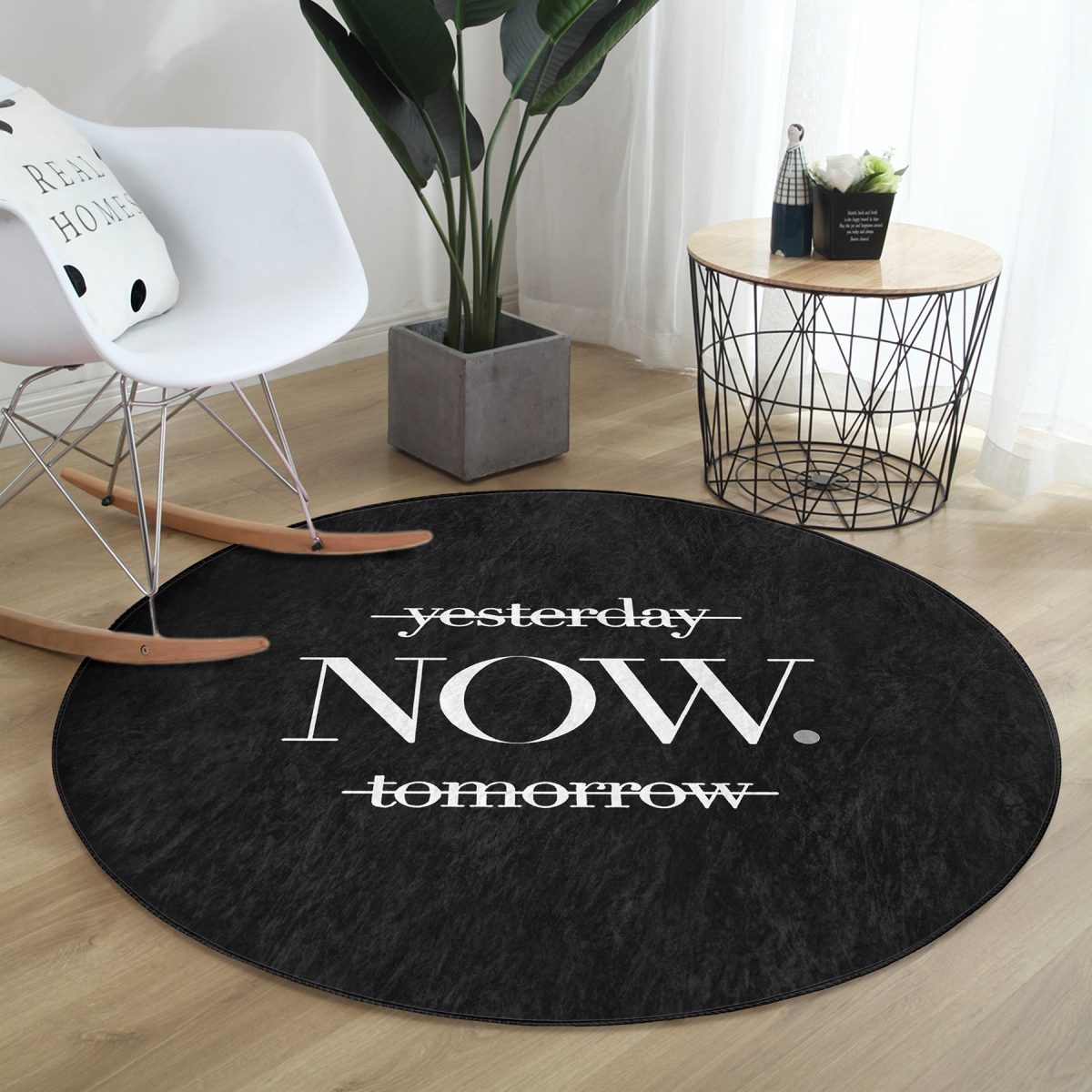 Realhomes Siyah Zeminde NOW Yazılı Modern Mutfak Yıkanabilir Kaymaz Tabanlı Yuvarlak Kadife Halı