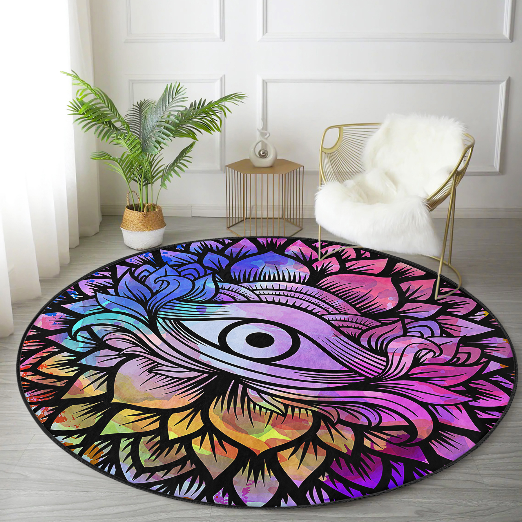 Realhomes Siyah Zeminde Renkli Üçüncü Göz Motifli Lacivert Salon ve Oturma Odası Yıkanabilir Kaymaz Tabanlı Yuvarlak Halı