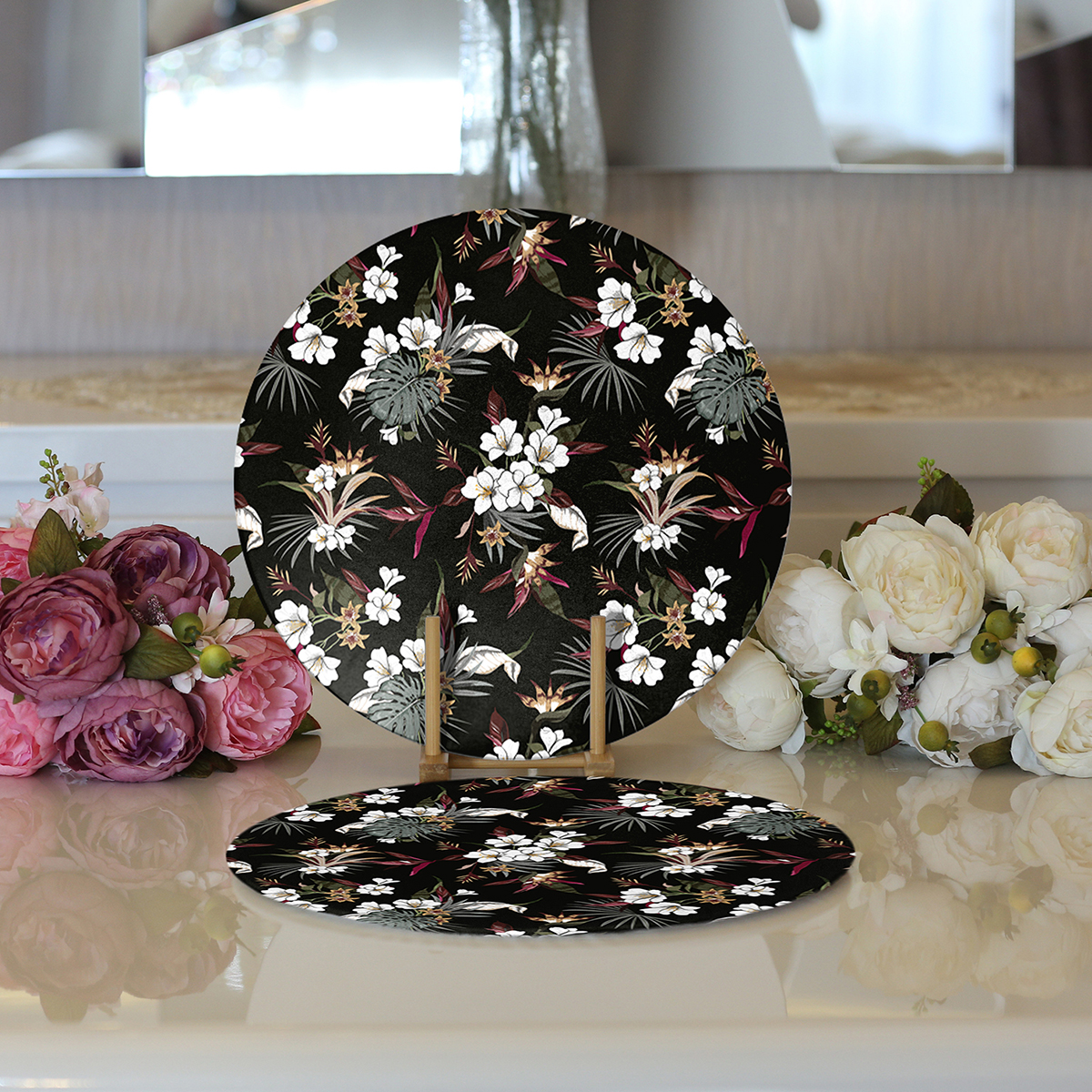 Realhomes Siyah Zeminli Beyaz Çiçek Desenli Dijital Baskılı Modern 2’li Yuvarlak Servis Altlığı – Supla