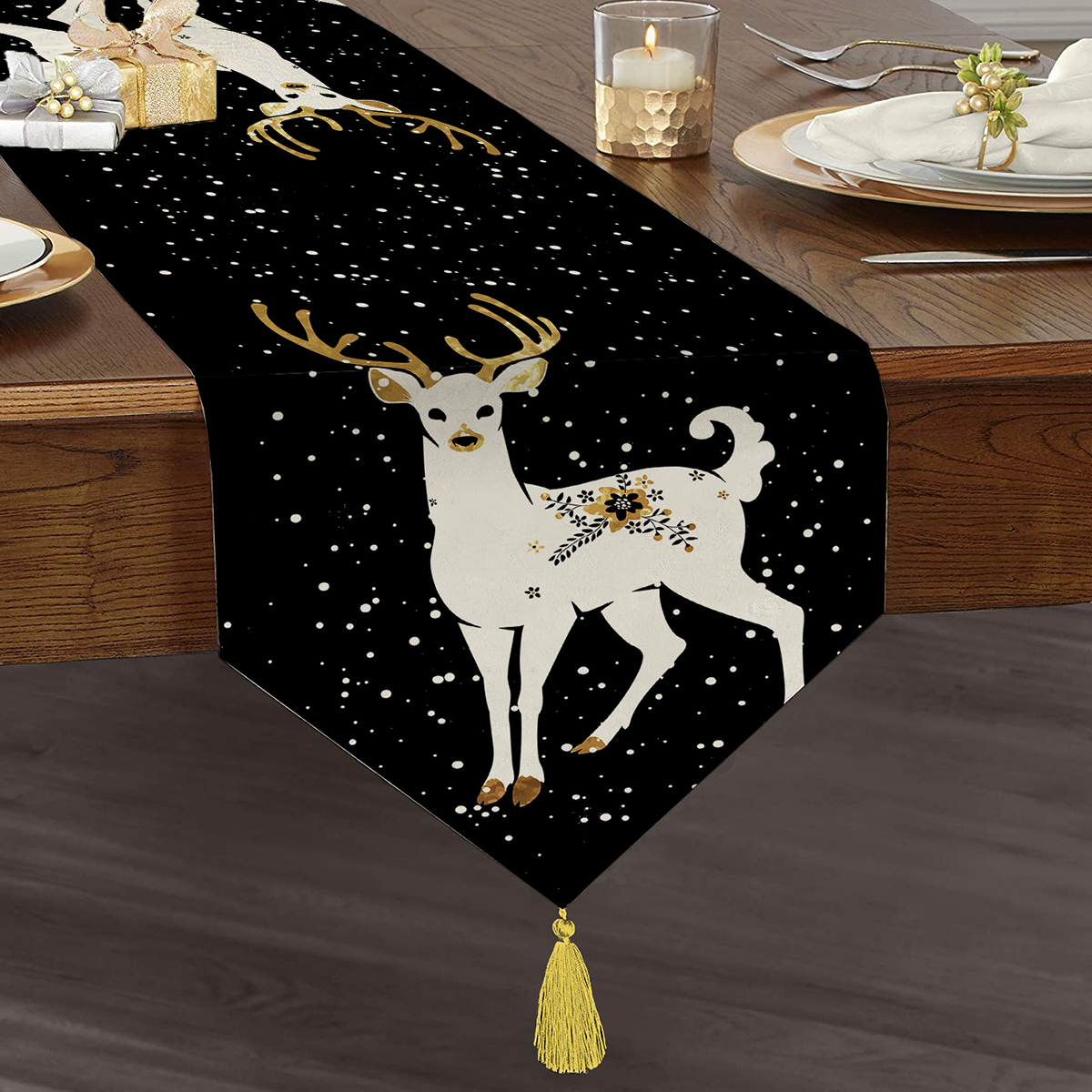 Realhomes Siyah Zeminnde Geyik Desenli Dijital Baskılı Özel Tasarım Püsküllü Şönil Üçgen Runner