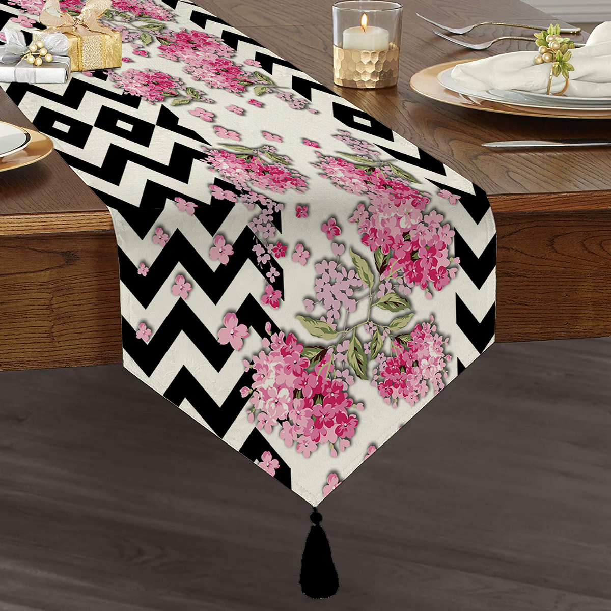 Realhomes Siyah Zigzag Zeminde Ilkbahar Çiçekleri Temalı Püsküllü Şönil Üçgen Runner