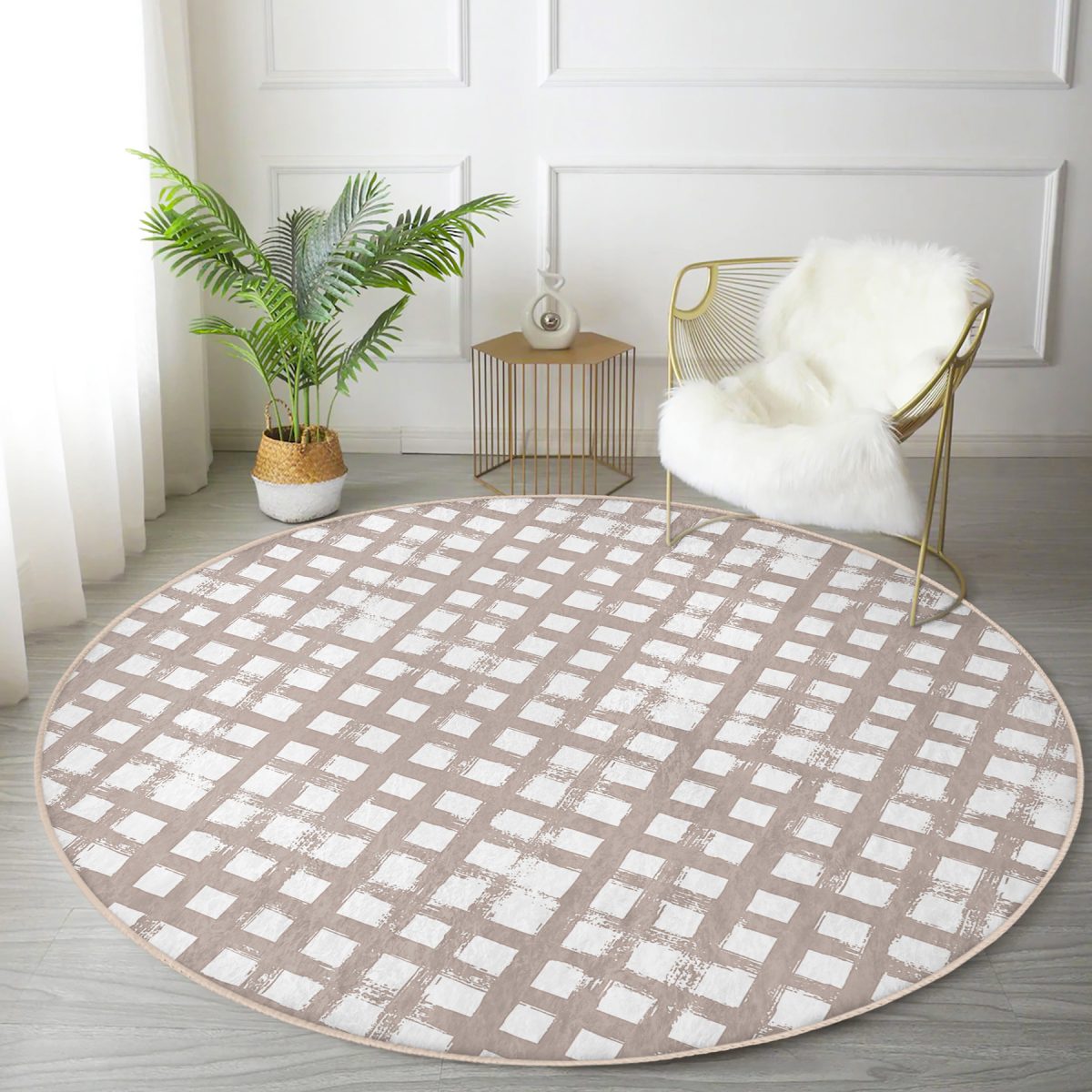 Realhomes Vizon Zeminde Geometrik Kare Motifli Krem Ofis Yıkanabilir Kaymaz Tabanlı Yuvarlak Kadife Halı