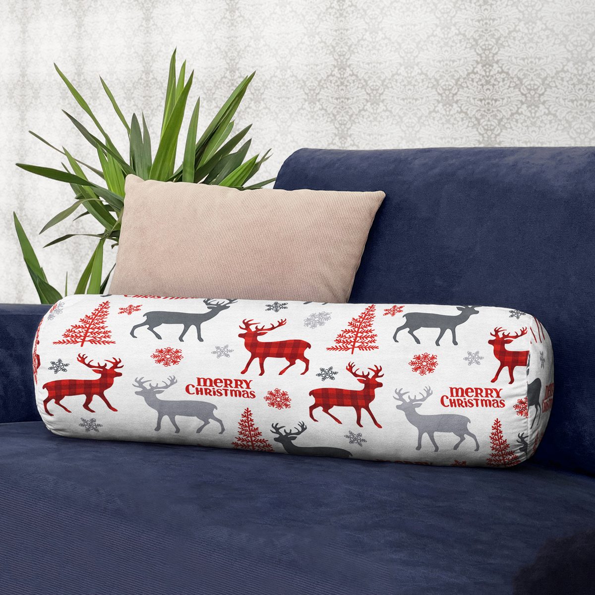 Realhomes Yılbaşı Geyik ve Ağaçlar Temalı Modern İç Dolgulu – Fermuarlı Süet Silindir Yuvarlak Yastık Kırlent