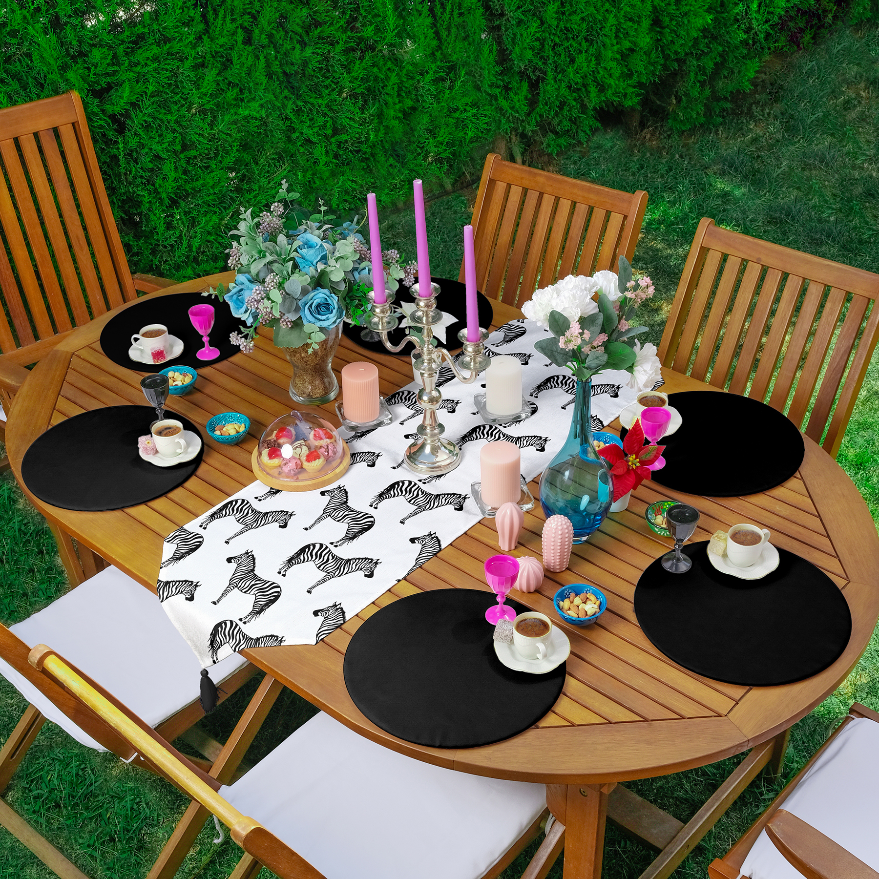 Realhomes Zebra Tasarımlı Püsküllü Runner & 6’lı Siyah Düz Renk Supla – Servis Altlığı