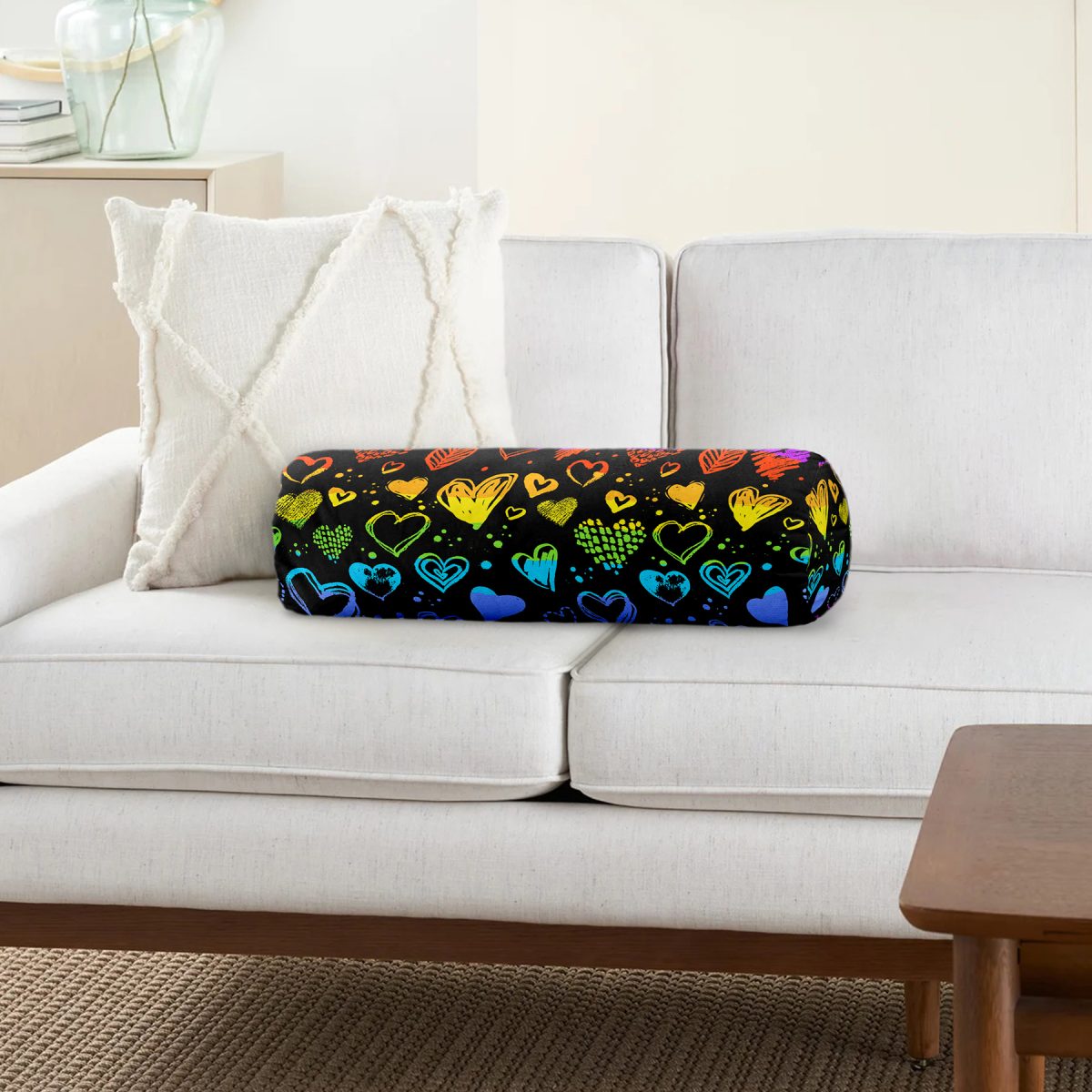 Rengarenk Kalp Desenli Özel Tasarım Dijital Baskılı Modern İç Dolgulu – Fermuarlı Süet Silindir Rulo Yastık Kırlent