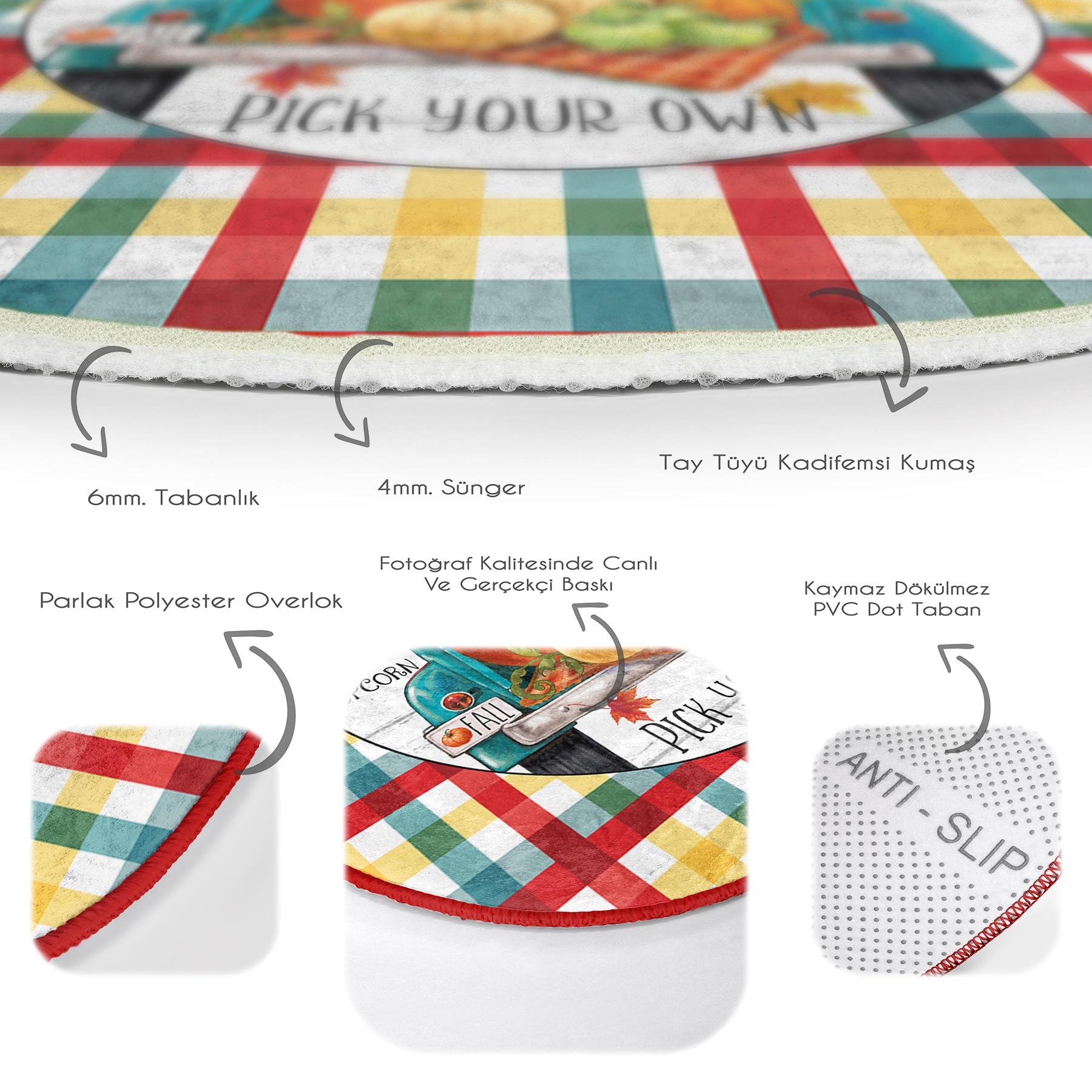 Renkli Ekose Özel Tasarım Kabak Motifli Modern Kahverengi Banyo Yıkanabilir Kaymaz Tabanlı Yuvarlak Halı
