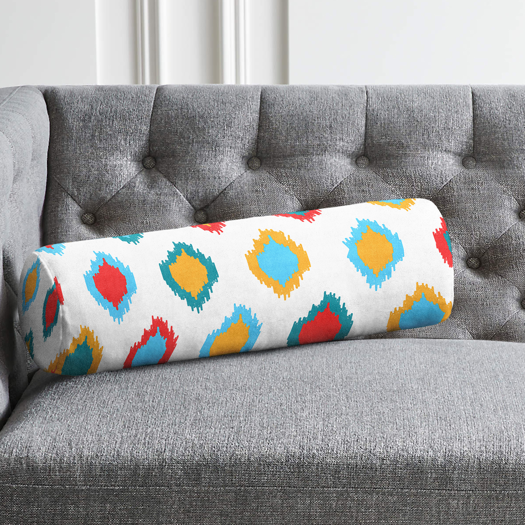 Renkli Geometrik Çizimli Dijital Baskılı İç Dolgulu – Fermuarlı Süet Silindir Yuvarlak Yastık Kırlent
