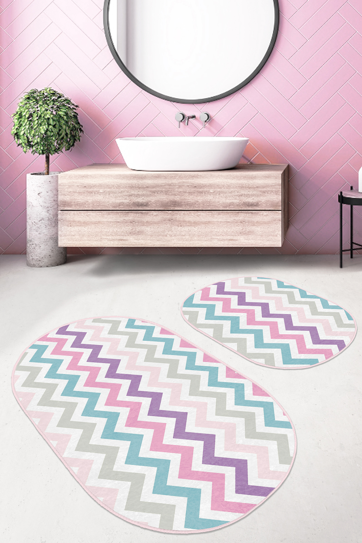 Renkli Geometrik Zigzag Özel Tasarım 2’li Oval Kaymaz Tabanlı Banyo & Mutfak Paspas Takımı