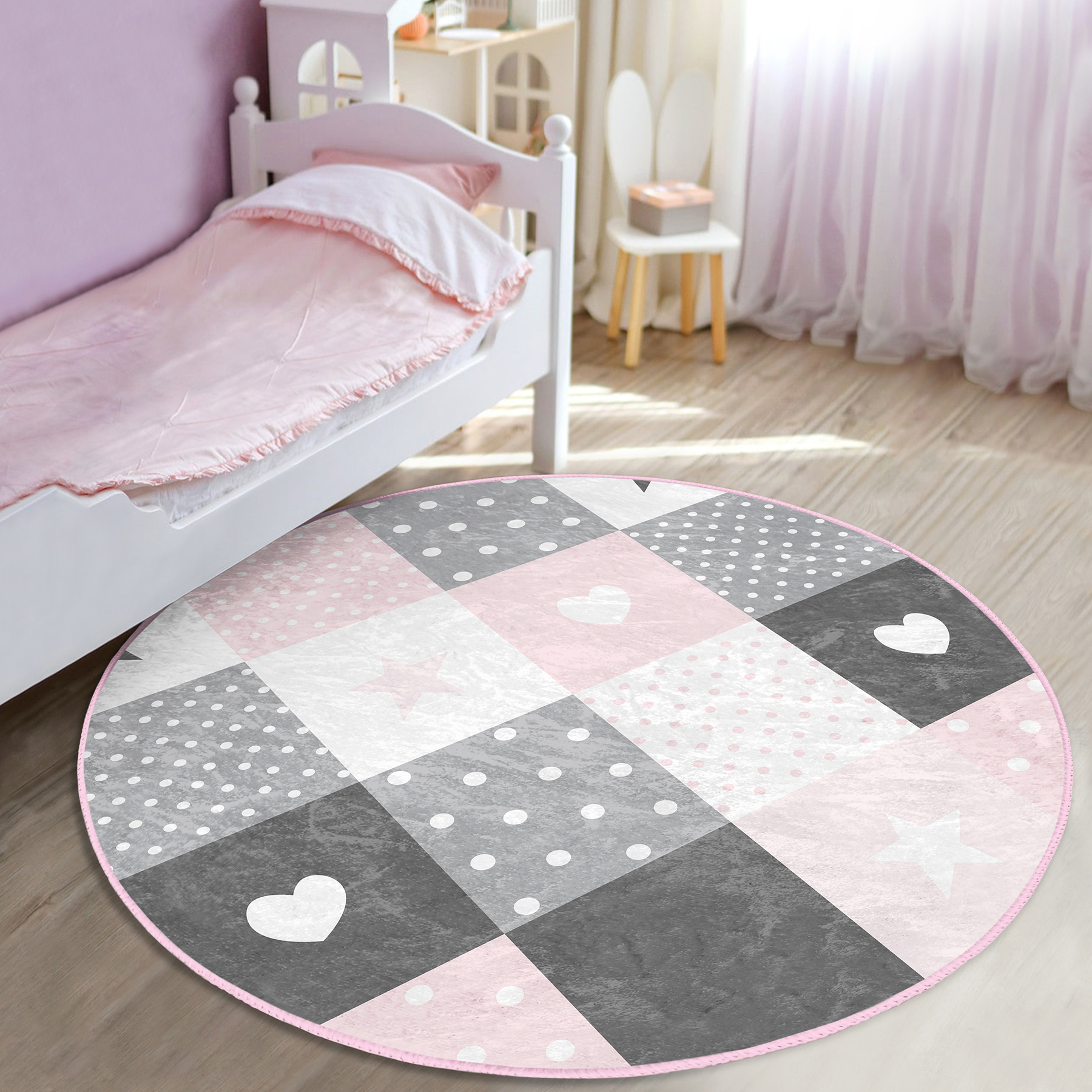 Renkli Kareler Geometrik Tasarımlı Çocuk & Genç Odası Makinede Yıkanabilir Kaymaz Tabanlı Yuvarlak Çocuk Halısı