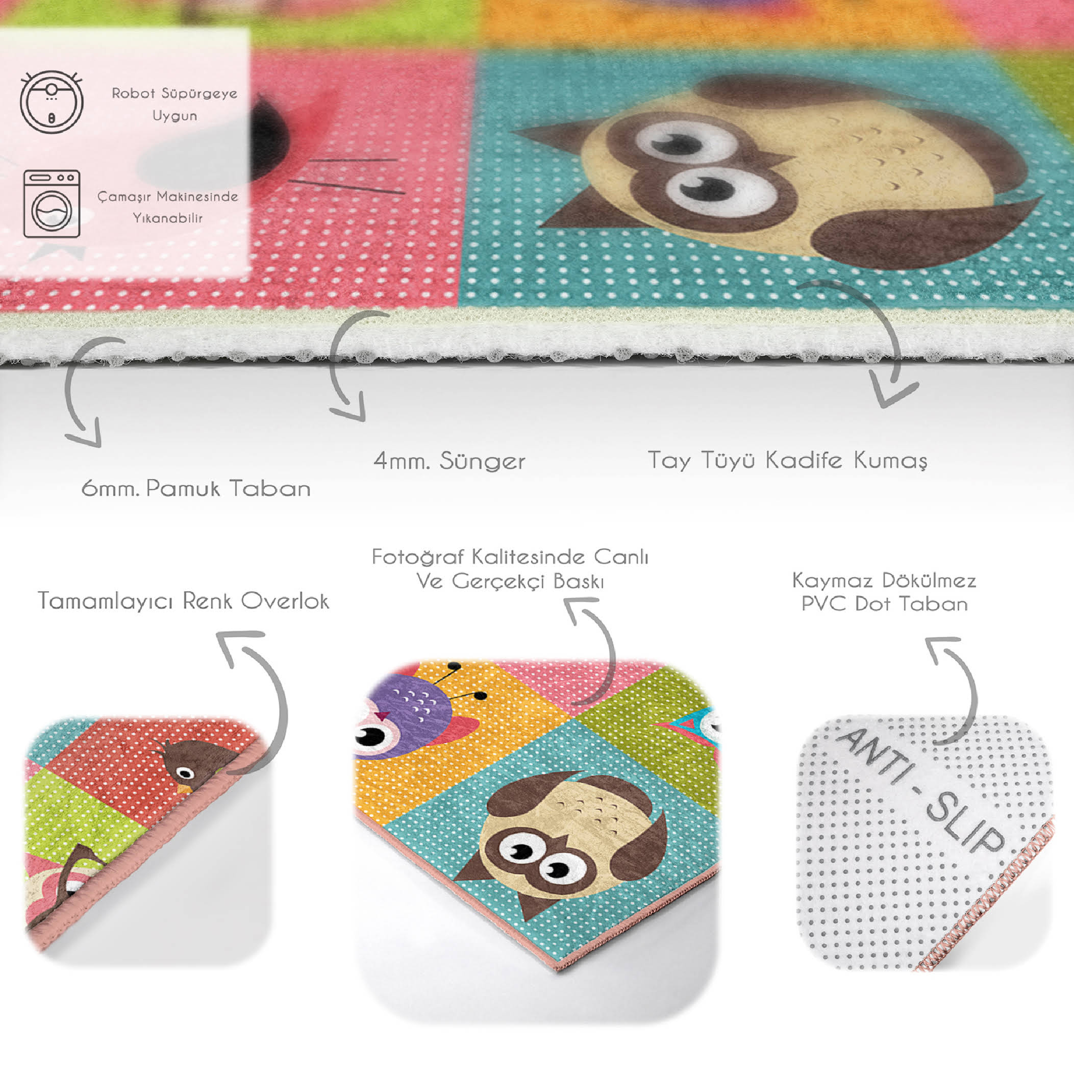 Renkli Kareli Puantiye Sevimli Baykuşlar Çocuk & Genç Odası Makinede Yıkanabilir Kaymaz Tabanlı Dikdörtgen Leke Tutmaz Çocuk Odası Halısı