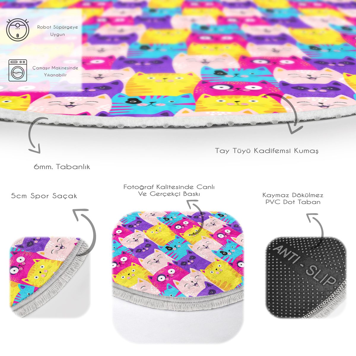 Renkli Kedicikler Çocuk & Genç Odası Makinede Yıkanabilir Kaymaz Tabanlı Püsküllü Yuvarlak Çocuk Halısı