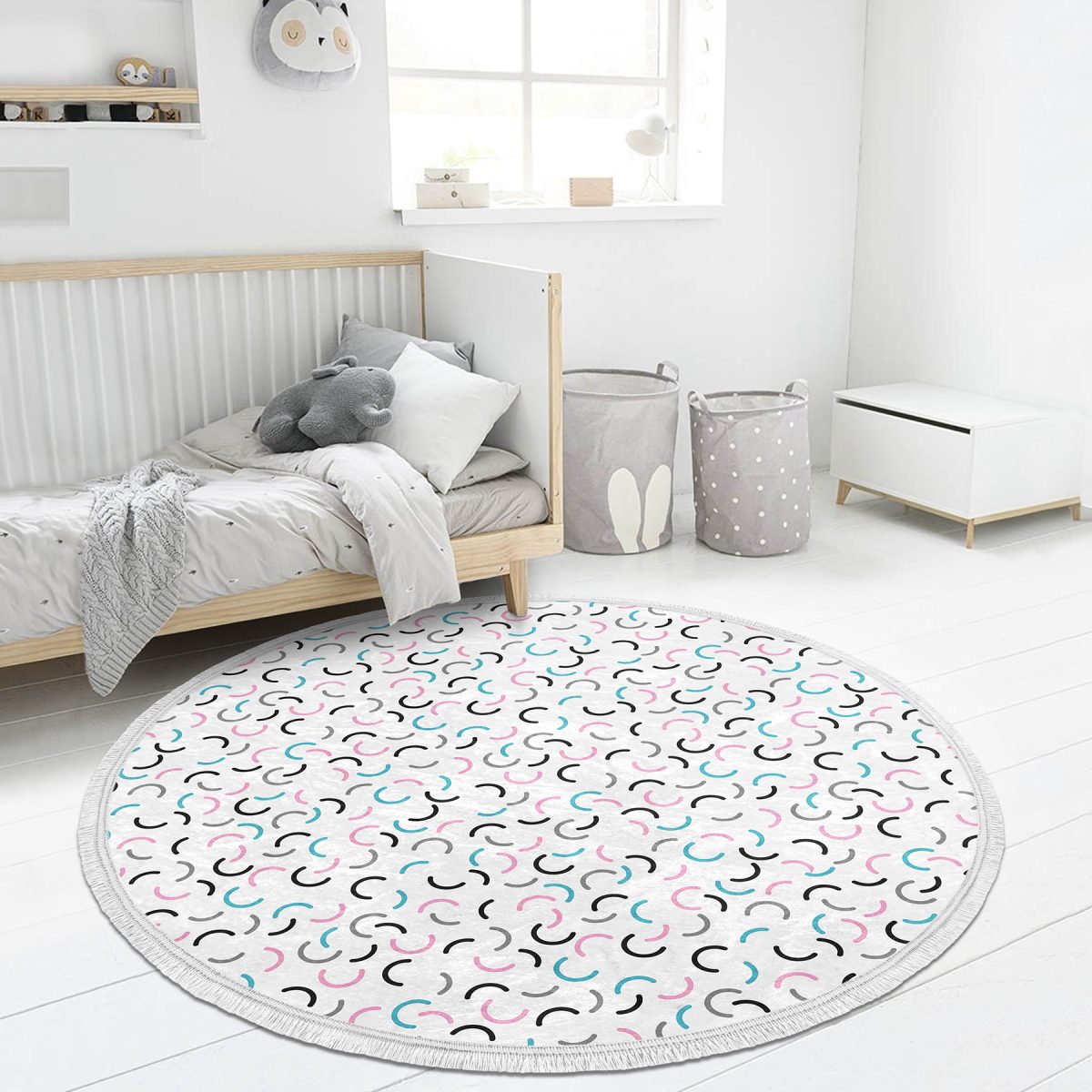 Renkli Oval Çizgi Tasarımlı Çocuk & Genç Odası Makinede Yıkanabilir Kaymaz Tabanlı Püsküllü Yuvarlak Çocuk Halısı