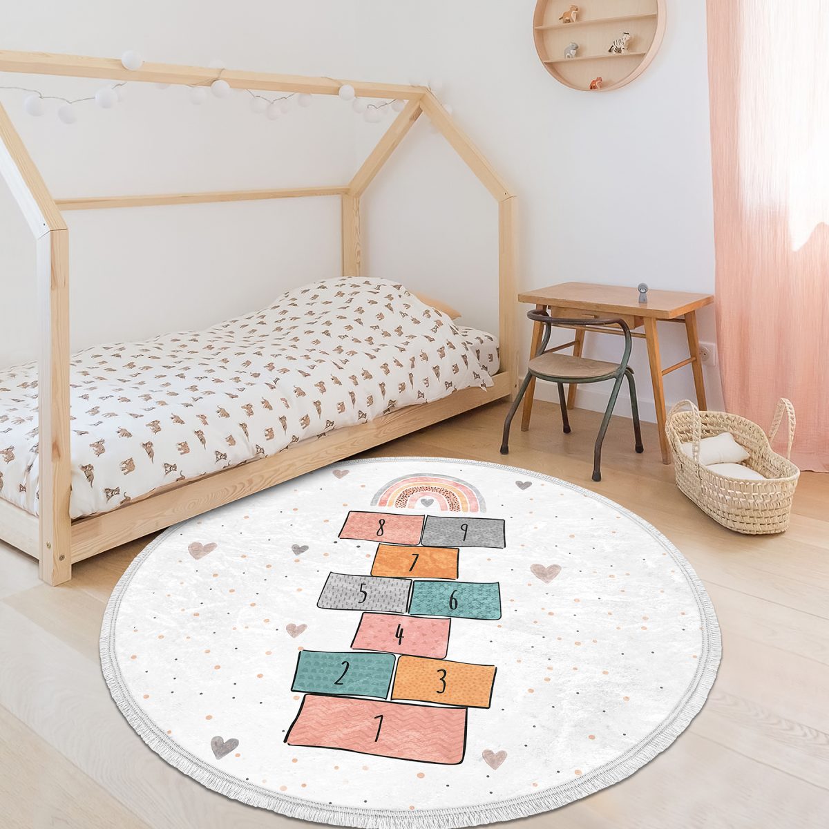 Renkli Seksek Temalı Eğitici Oyun Çizimli Çocuk & Genç Odası Makinede Yıkanabilir Kaymaz Tabanlı Püsküllü Yuvarlak Çocuk Oyun Halısı