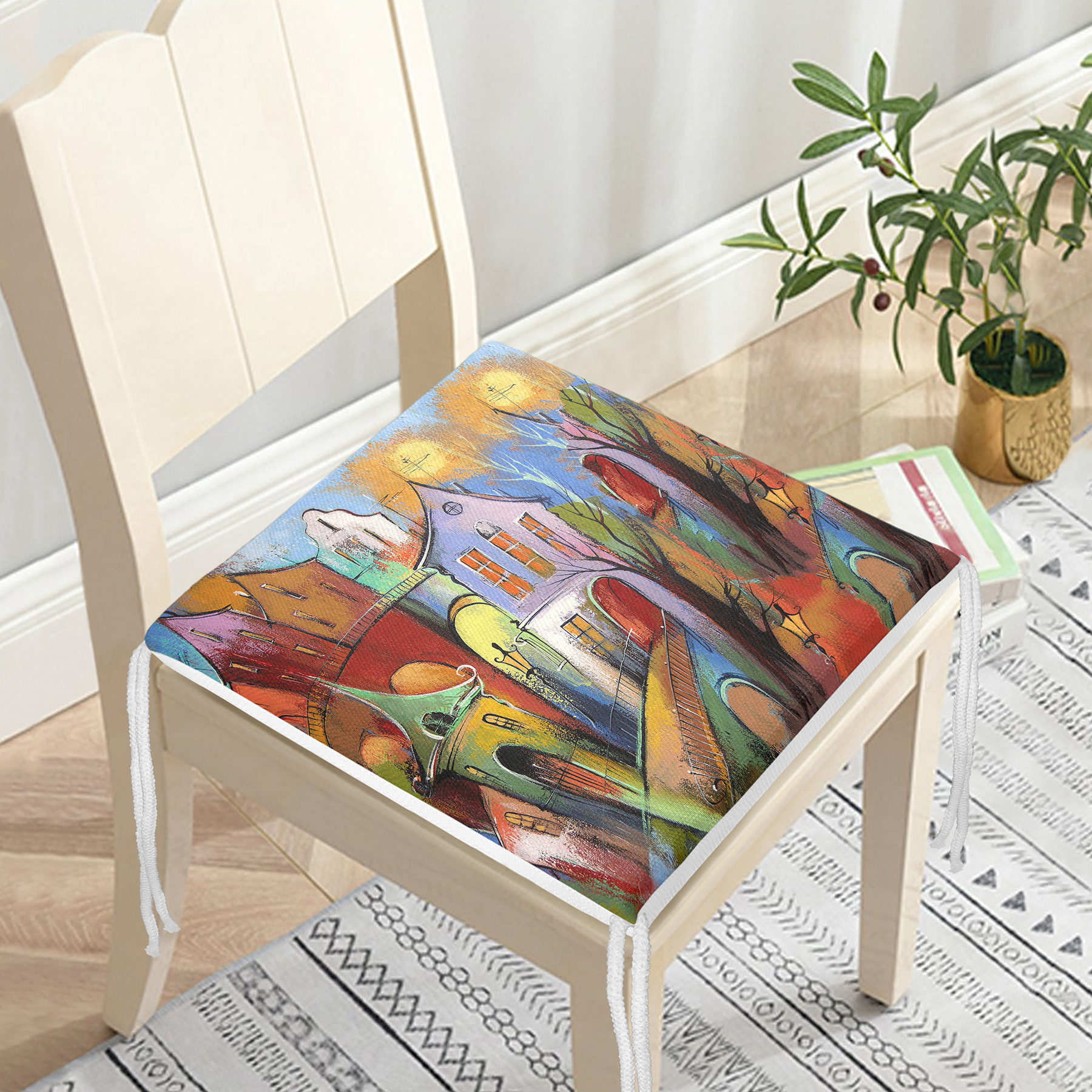 Renkli Sulu Boya Çizimli Gece Kondu Evleri Motifli Dekoratif Fermuarlı Sandalye Minderi