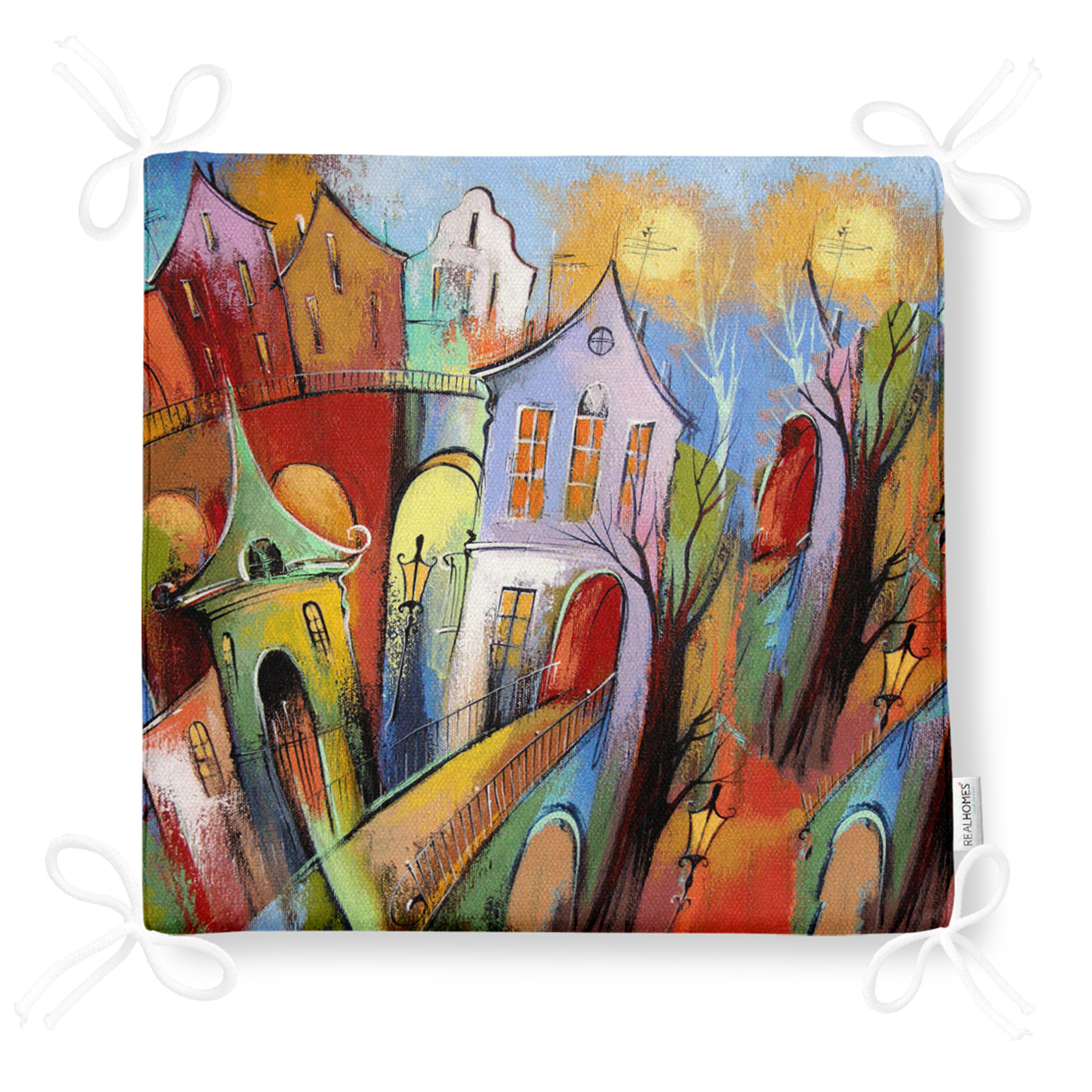 Renkli Sulu Boya Çizimli Gece Kondu Evleri Motifli Dekoratif Fermuarlı Sandalye Minderi Realhomes