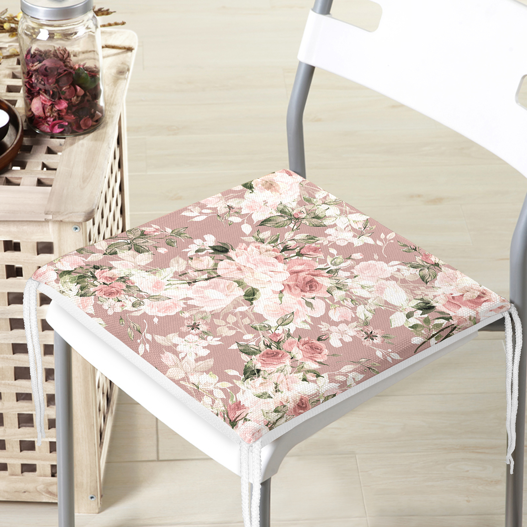 Renkli Zemin Üzerinde Beyaz Çiçek Desenli Dijital Baskılı Modern Fermuarlı Sandalye Minderi