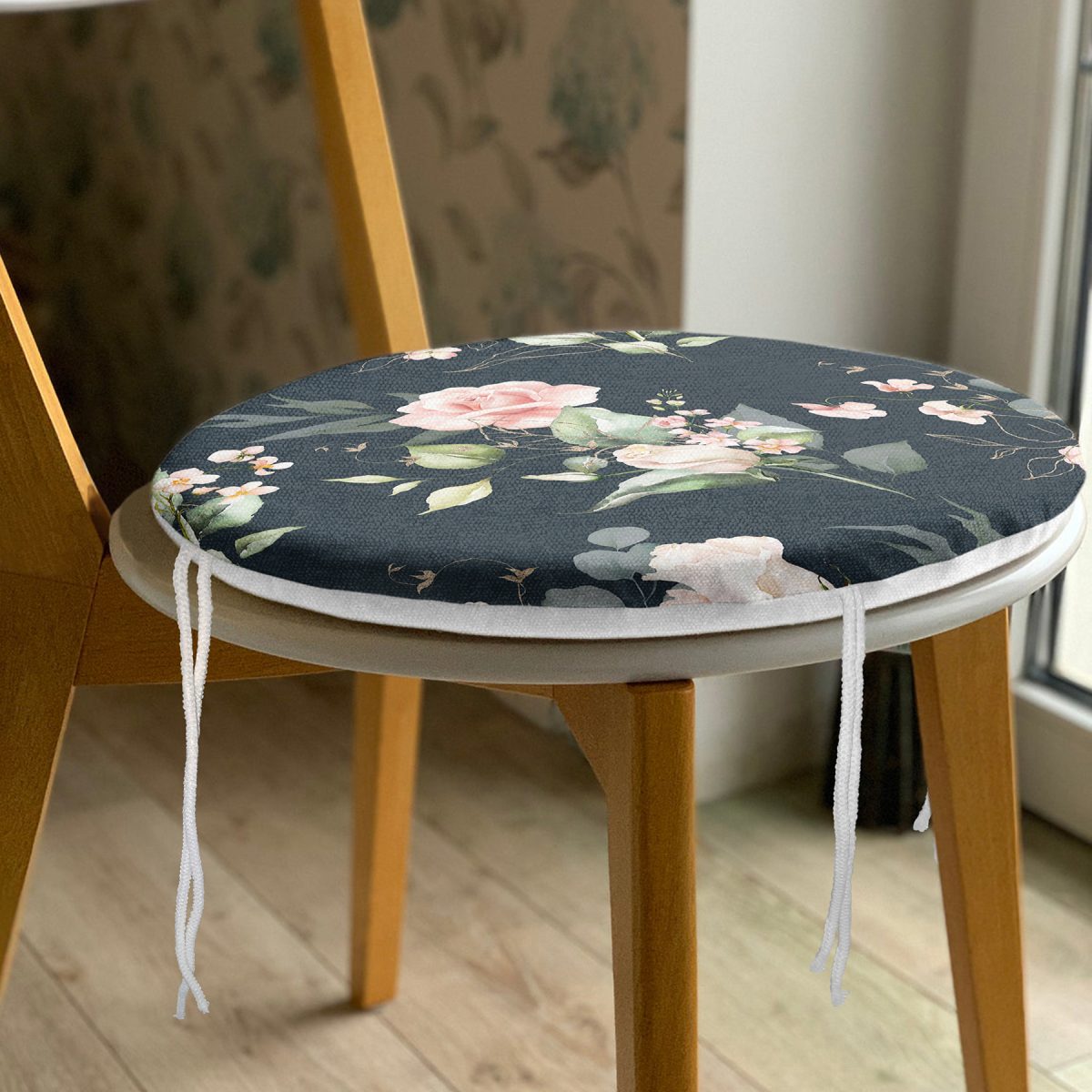 Renkli Zemin Üzerinde Beyaz Çiçek Desenli Dijital Baskılı Modern Yuvarlak Fermuarlı Sandalye Minderi