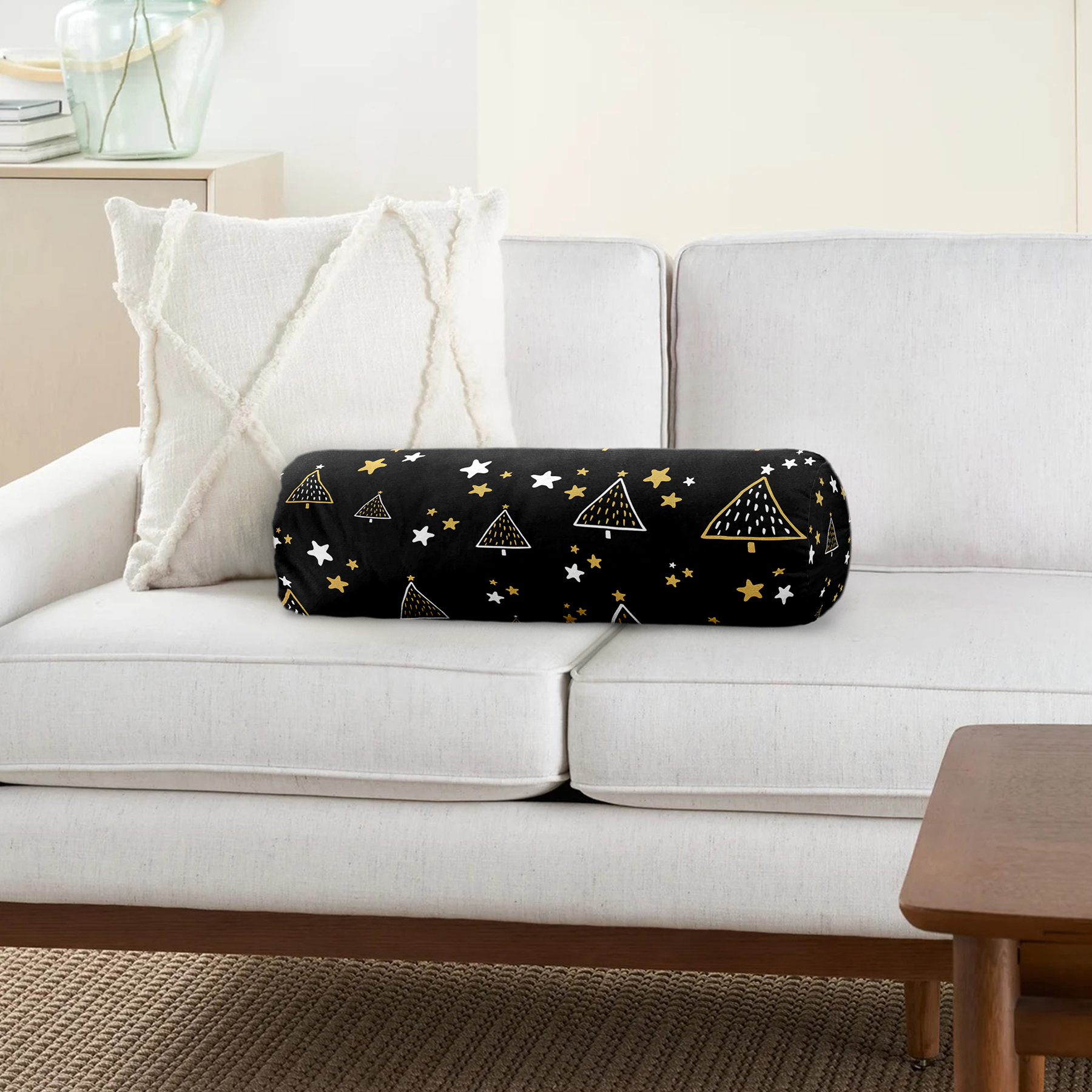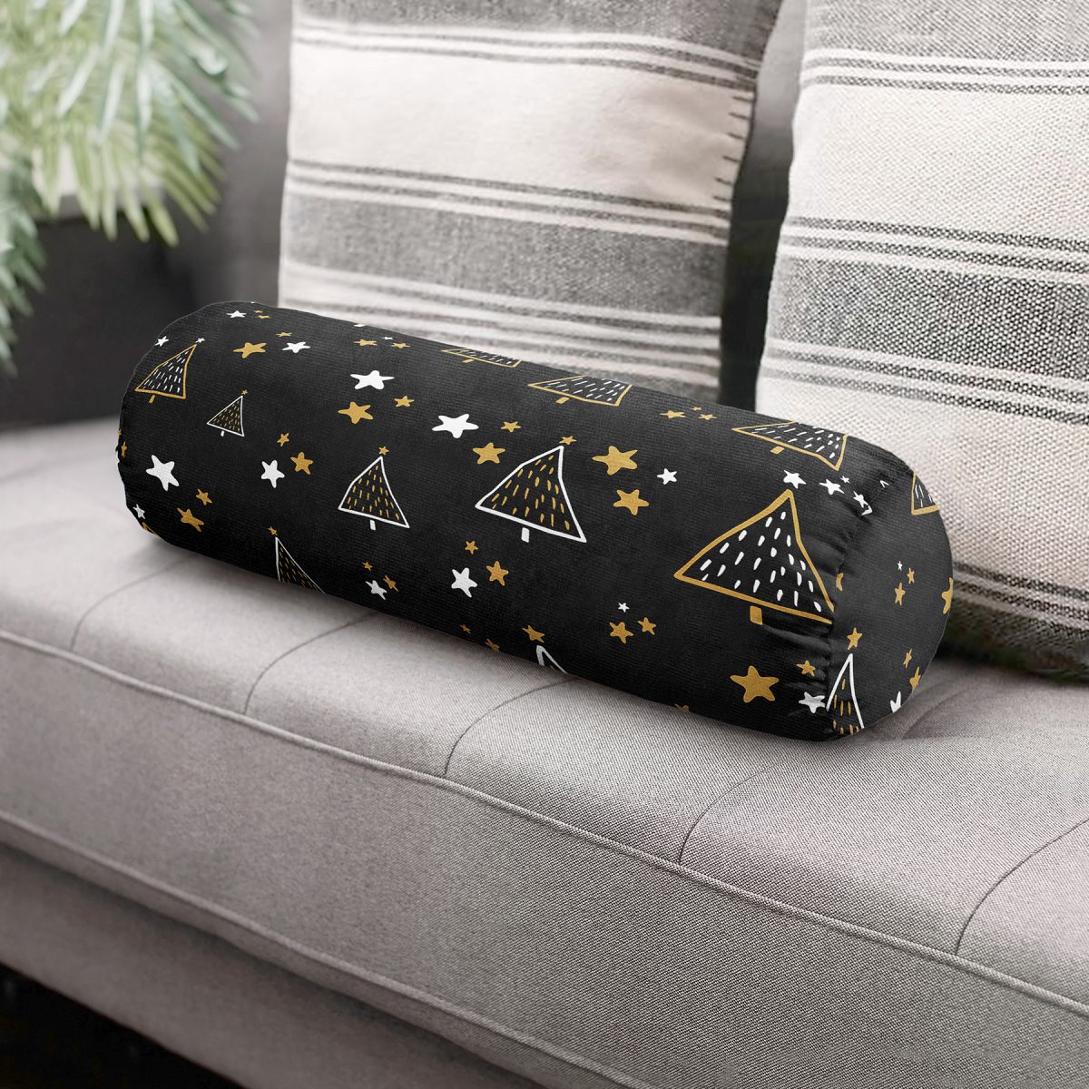 Renkli Zemin Üzerinde Çam Ağacı Desenli Dijital Baskılı Modern İç Dolgulu Fermuarlı Çok Amaçlı Silindir Yastık Kırlent