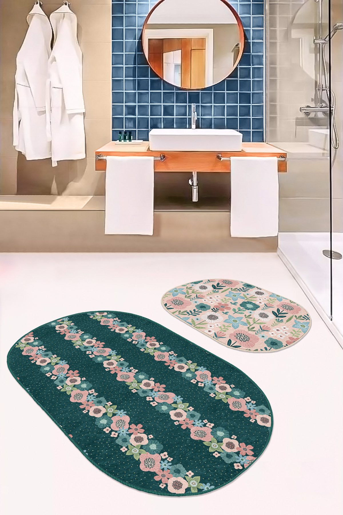 RealHomes Dijital Baskılı Kaymaz Tabanlı 2’li Oval Banyo Paspası, kumaş seçimi ve dikiş detaylarıyla şık bir dekorasyon öğesi olarak kullanımınıza sunulmaktadır. Her bir desen RealHomes tasarımcıları tarafından özenle tasarlanmış ve satışa sunulmuştur. Fotoğraf kalitesinde canlı ve gerçekçi baskılarımız yıkamaya ve kullanıma bağlı olarak solma yapmaz, yıllar boyu ilk günkü özelliğini korur.