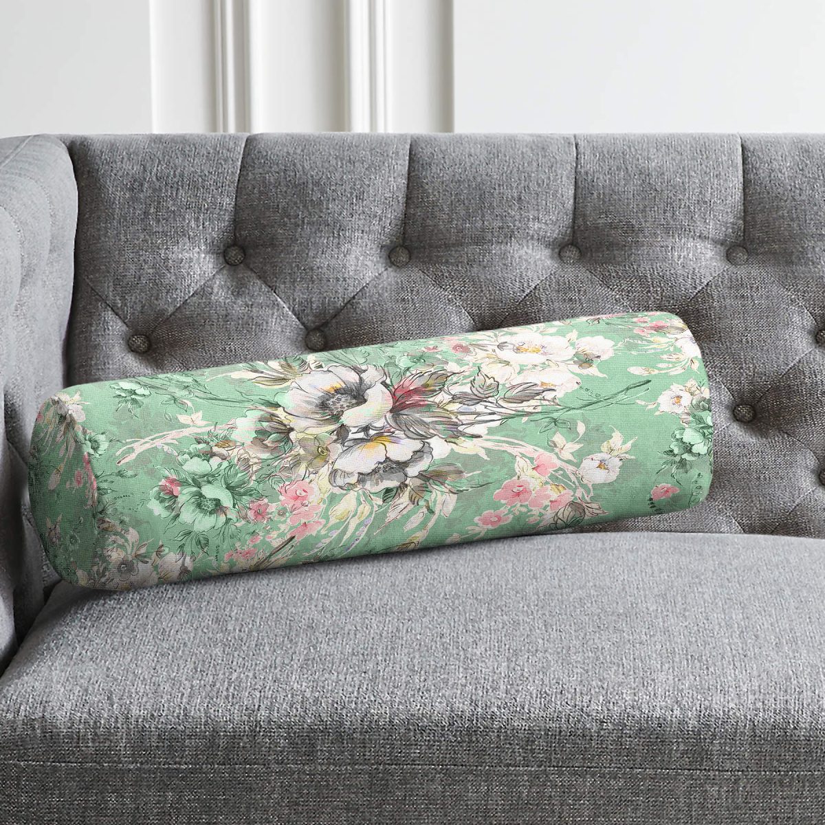 Renkli Zemin Üzerinde Çiçek Motifli Dijital Baskılı Modern İç Dolgulu Süet Silindir Yastık Kırlent – Bel Yastığı