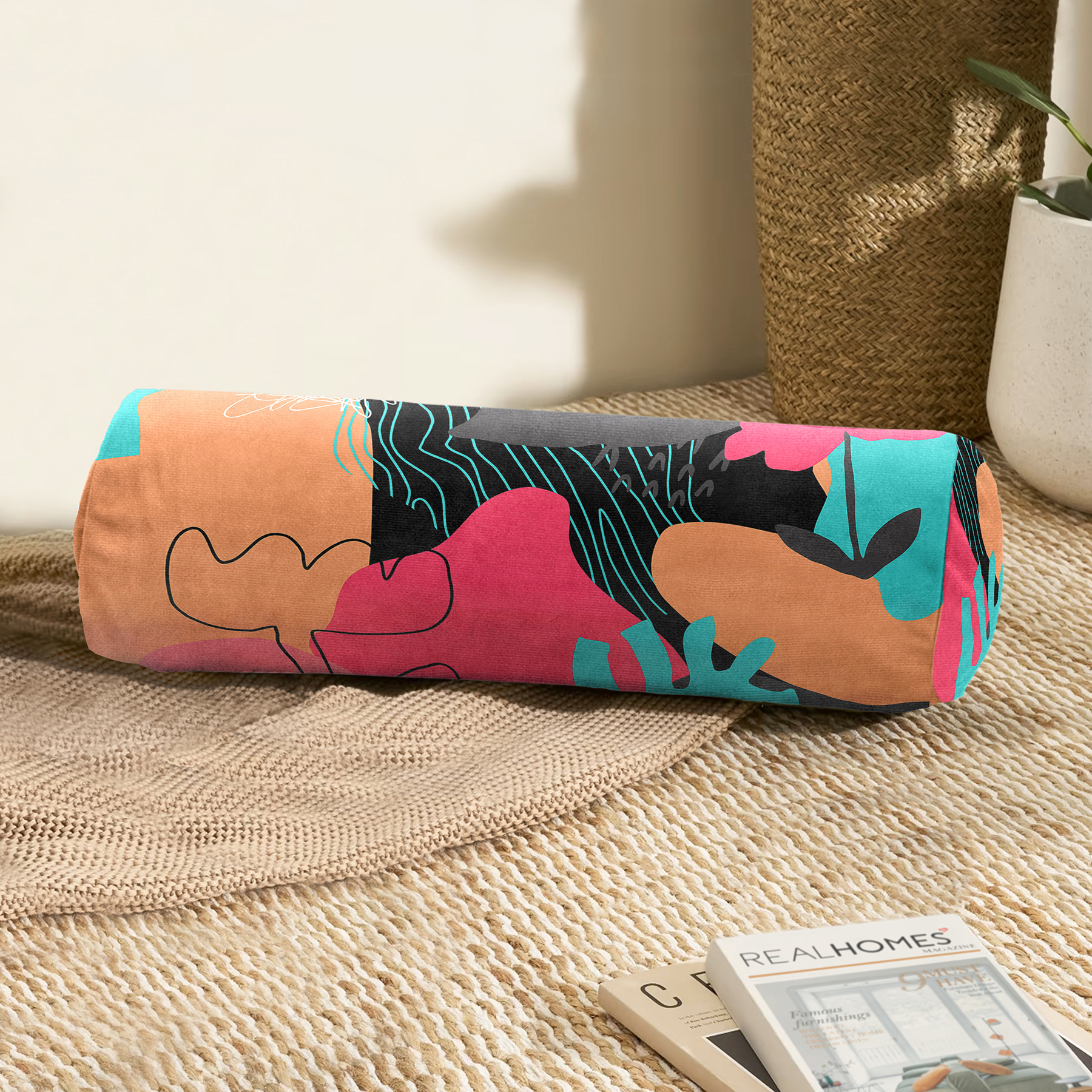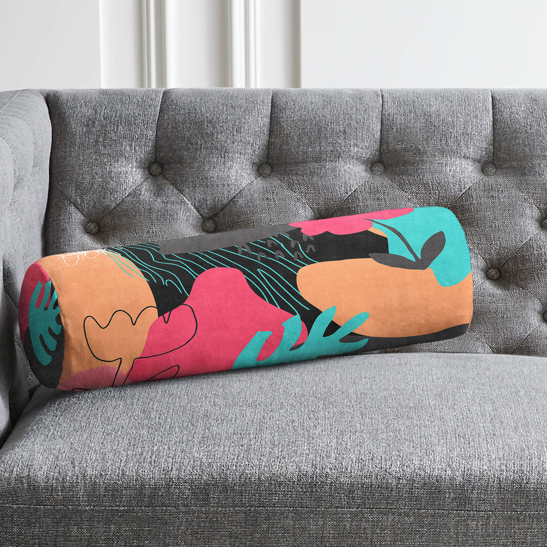 Renkli Zemin Üzerinde Geometrik Yaprak Desenli Dijital Baskılı Modern İç Dolgulu – Fermuarlı Süet Berjer Silindir Yastık Kırlent
