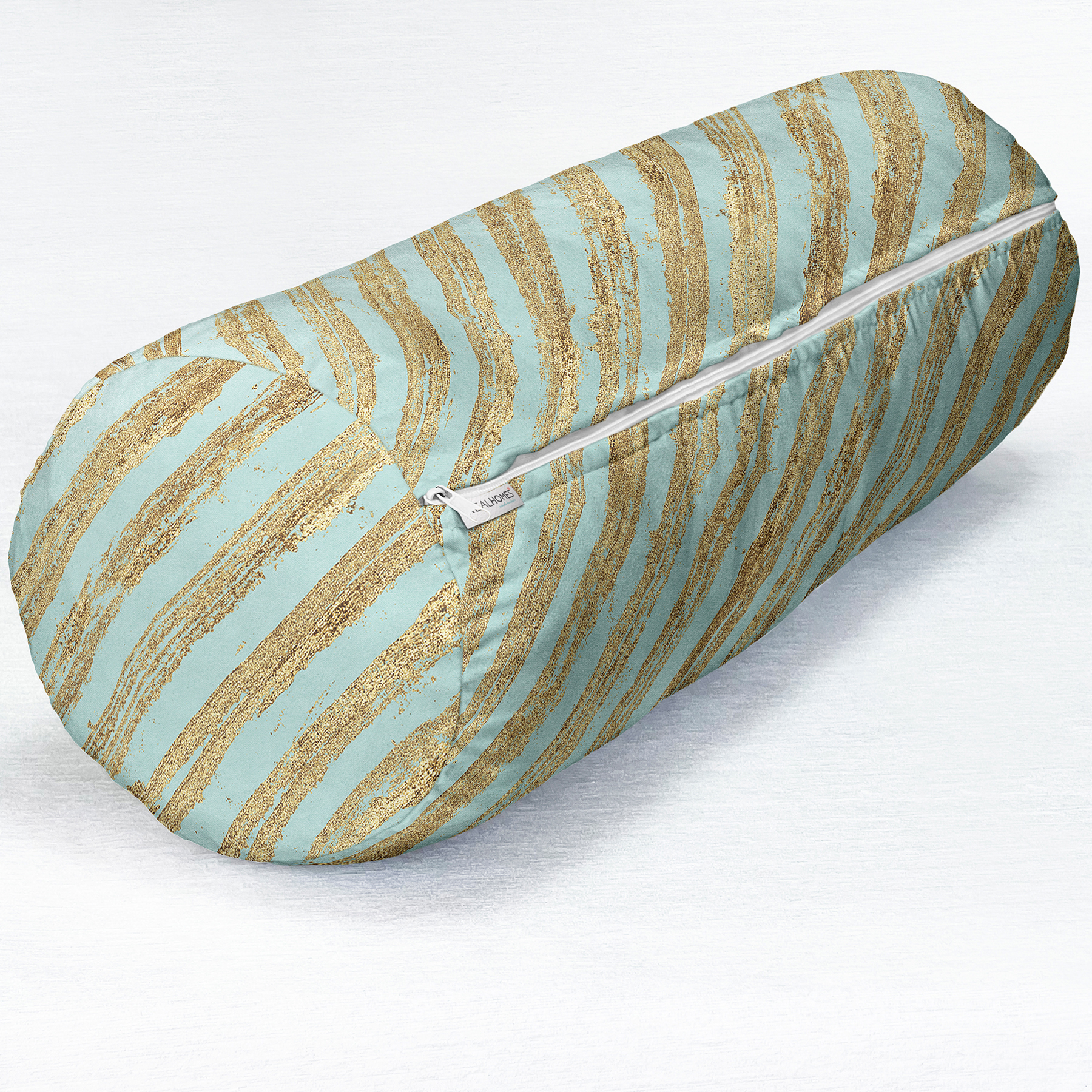 Renkli Zemin Üzerinde Gold Detaylı Yatay Çizgili Dijital Baskılı Modern İç Dolgulu Yumuşak Silindir Form Yastık Kırlent